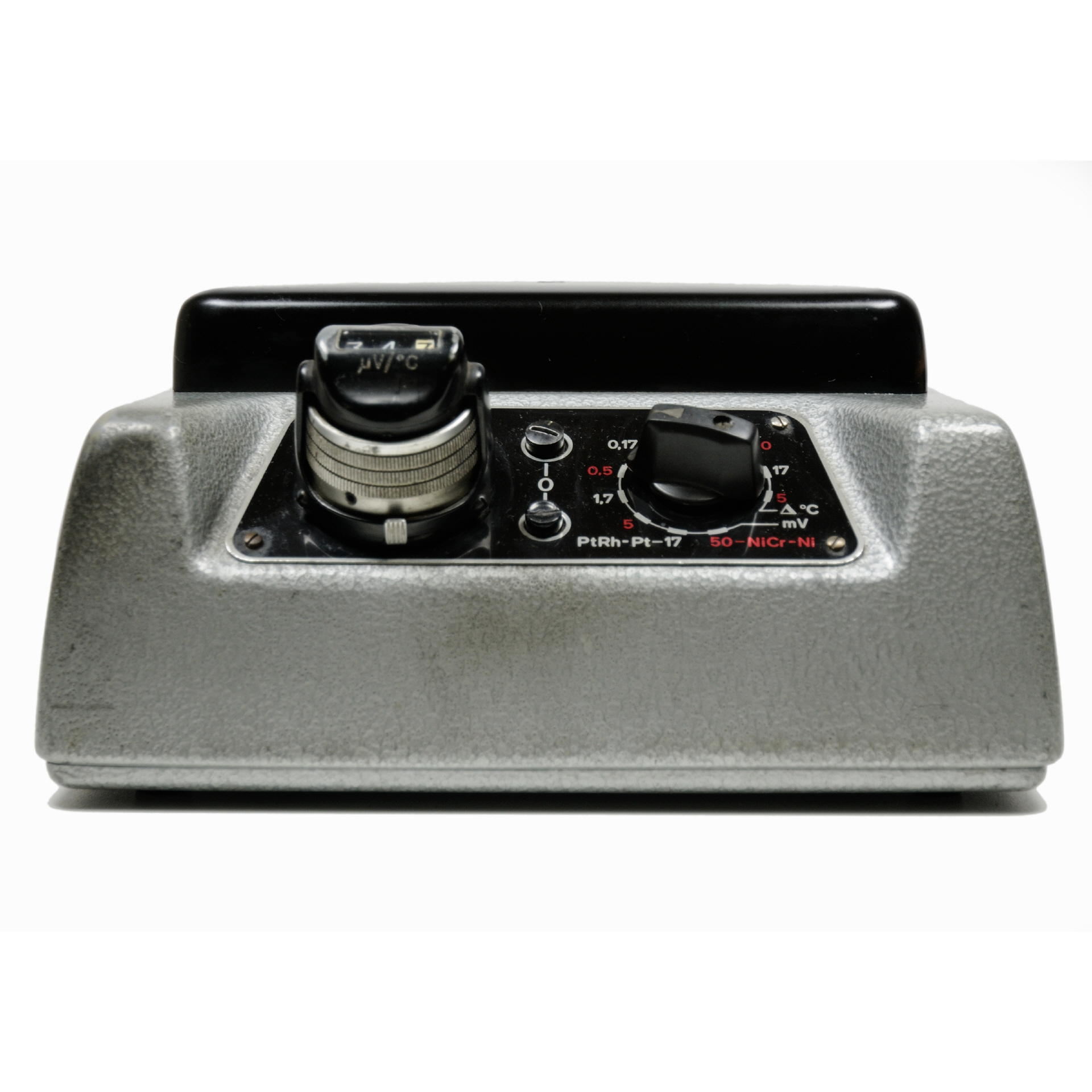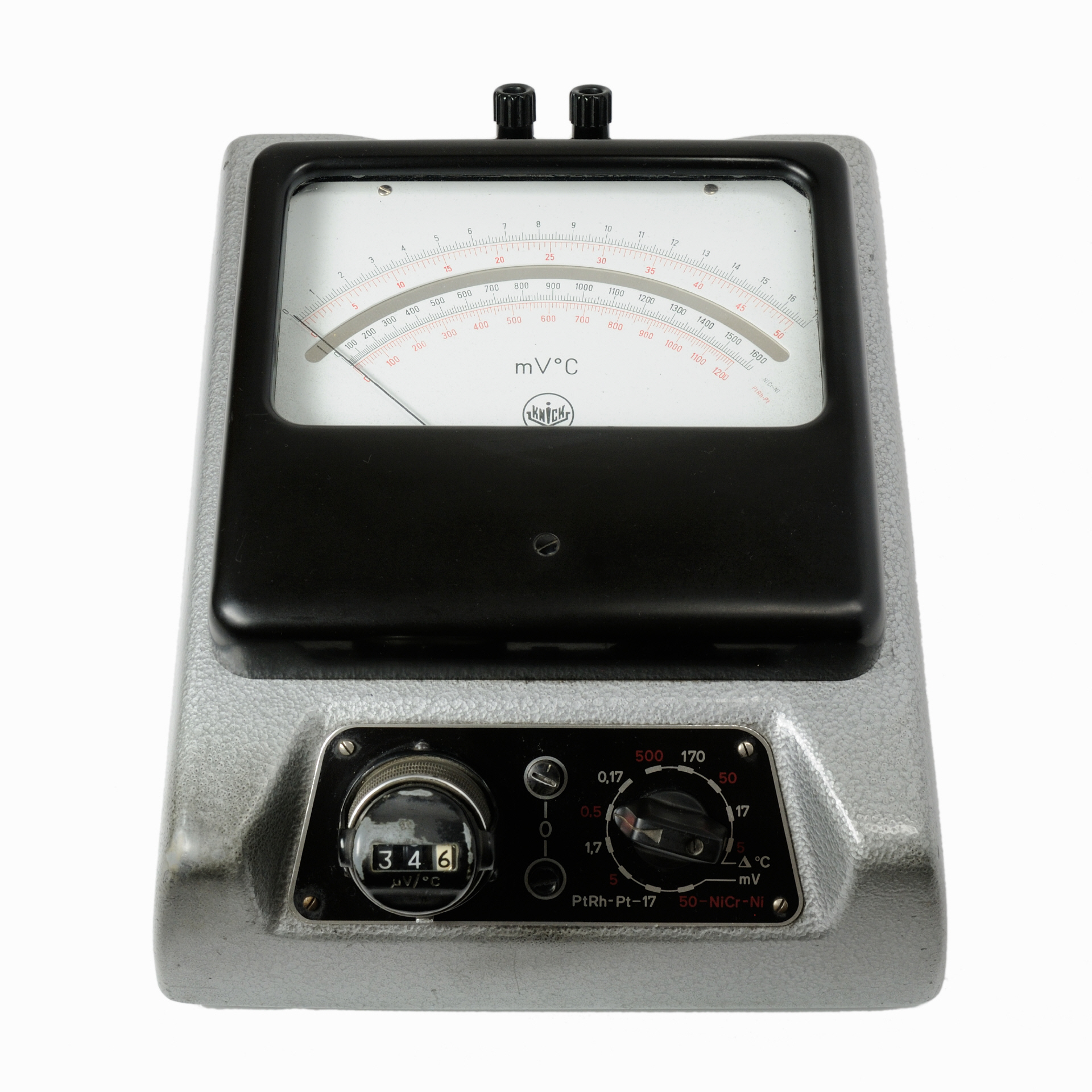 Das Messwerk ist in einem schweren Gehäuse aus Aluminiumguß eingebaut. Die Anzeige erfolgt über ein großes Drehspul-Messwerk (Hersteller Gossen). Neben dem Messbereichsumschalter befindet sich ein Präzisionsregler zur Eichung des Messfühlers, mit einem Einstellbereich von 300 ... 700 µV / °C. Auf der Rückseite finden sich die Anschlussklemmen für den Messfühler und die Stromversorgung. |