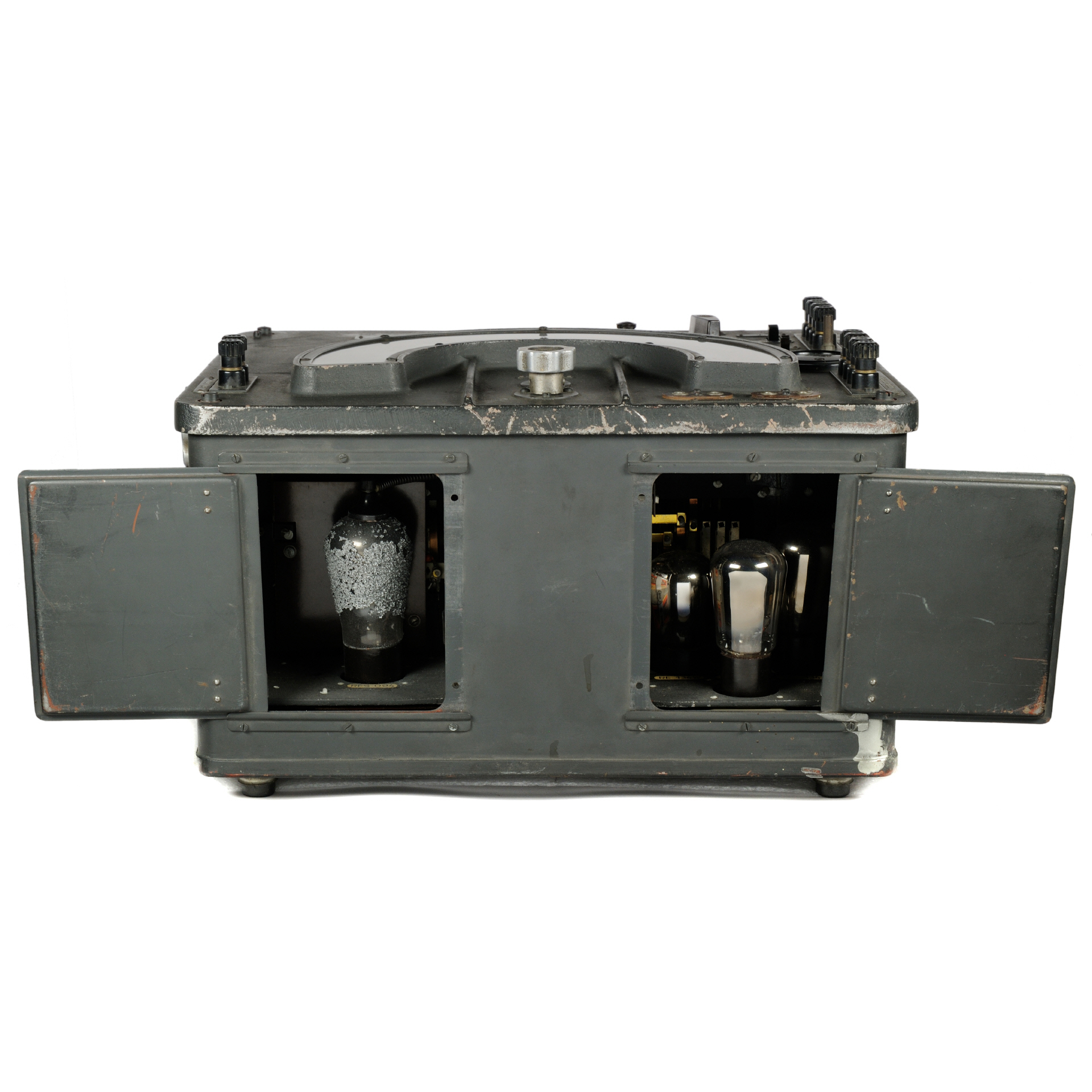 Zur Kontrolle der Betriebsspannung dient das rechte in die Frontplatte eingebaute Messinstrument. Das Auswechseln der Röhren ist nach Öffnen der an der Vorderseite des Geräts angebrachten Klappen leicht vorzunehmen. Besonderer Wert ist auf genaue Ablesemöglichkeit der gefundenen Einstellung gelegt. Die Skala ist zu diesem Zweck groß gehalten und mit Lupen- und Noniusablesung versehen. Das ganze Gerät ist in ein Leichtmetallgehäuse eingebaut und dadurch gegen mechanische und elektrische Einflüsse weitgehend geschützt. Das Gewicht des Geräts beträgt 20 kg.