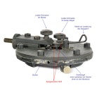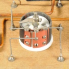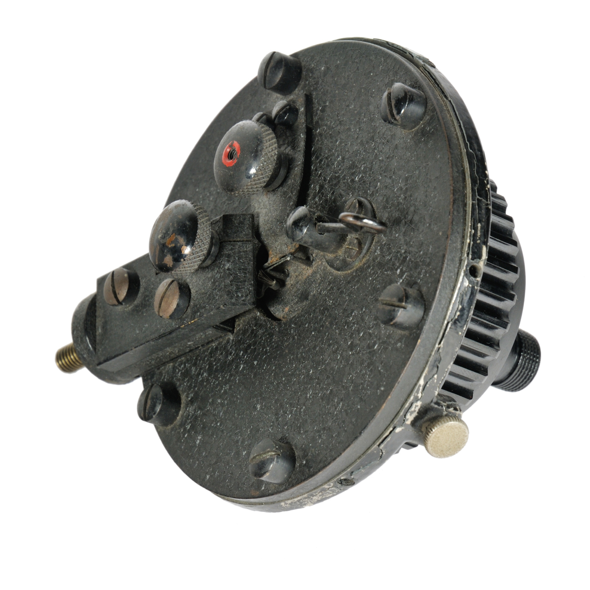 Antriebssystem: Das Antriebssystem, gefertigt von der Firma Stehle, besteht aus einem Federwerk mit Fliehkraftregler. Über diesen kann die Rotationsgeschwindigkeit des Drehspiegels eingestellt werden. Der Zinkfraß hat allerdings auch hier einige Teile befallen. |