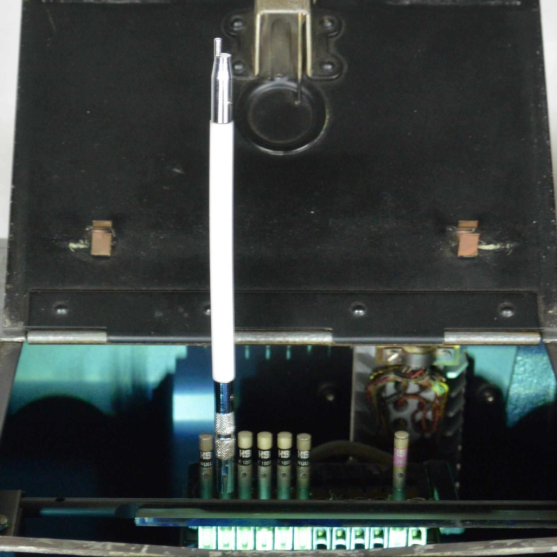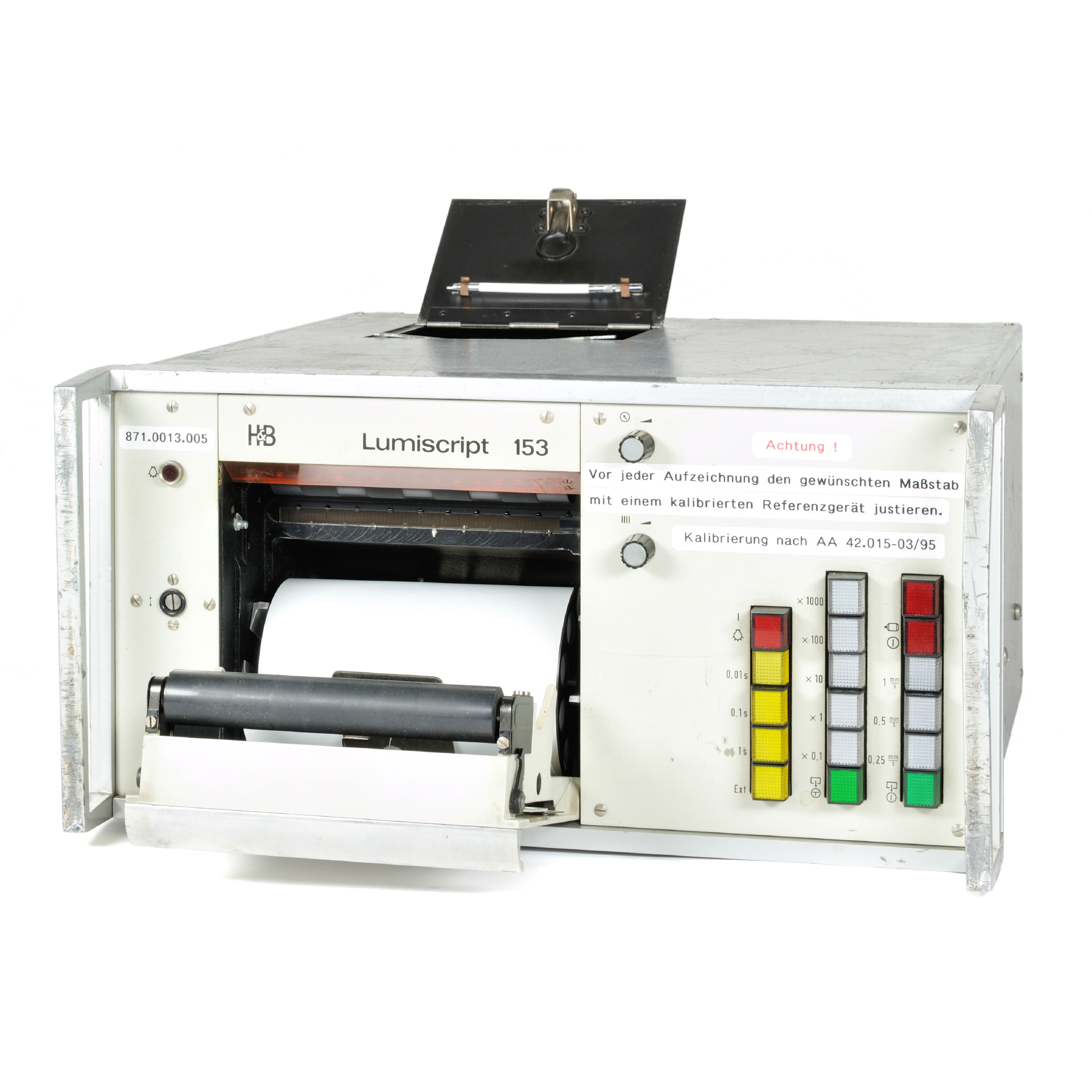 | Der LUMISCRIPT 153 ist eine Weiterentwicklung des LUMISCRIPT 150-8 und hat einen ähnlichen mechanischen und elektrischen Aufbau. Der Magnetblock ist zur Aufnahme von 12 Spulenschwingern vom Typ HMK ausgelegt. | |