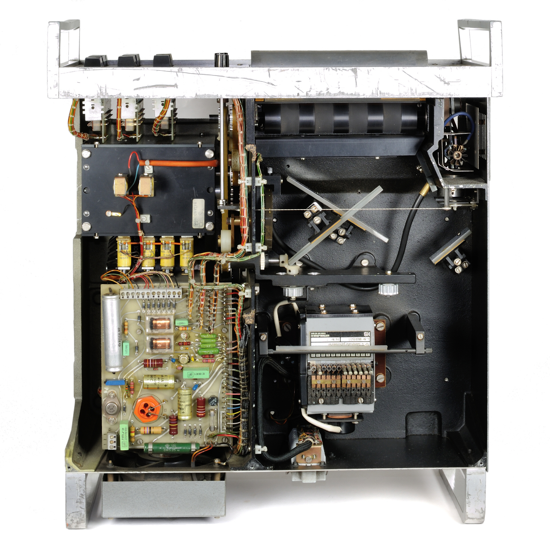 Der mechanische Aufbau des Gerätes basiert auf einem stabilen Chassis aus Leichtmetall, auf das alle Komponenten montiert sind. Deckel, Seitenwände und Boden können geöffnet werden, dadurch ist ein einfacher Zugang zu den elektrischen und mechanischen Bauteilen gewährleistet. Das Gerät ist für den Einbau in 19‘‘ Standard-Racks ausgelegt. Die wichtigsten Komponenten: Lichtquelle: Quecksilberdampf-Höchstdrucklampe Strahlengang: Zylinderoptik, Spiegelsystem Magnetsystem: Elektromagnet mit ca. 1 Tesla Feldstärke an den Polbohrungen Registriersystem: Spulenschwinger vom Typ HMK Antrieb: Synchron-Motor mit Außenläufer Netzteil: eingebaut, für standardmäßig 220V / 50 Hz Weitere Funktionen: Intensitätsregulierung Registriergeschwindigkeit bis 2000 m/s Papiervorschub bis 1000 mm/s Papierstandsanzeige Zeitmarken |