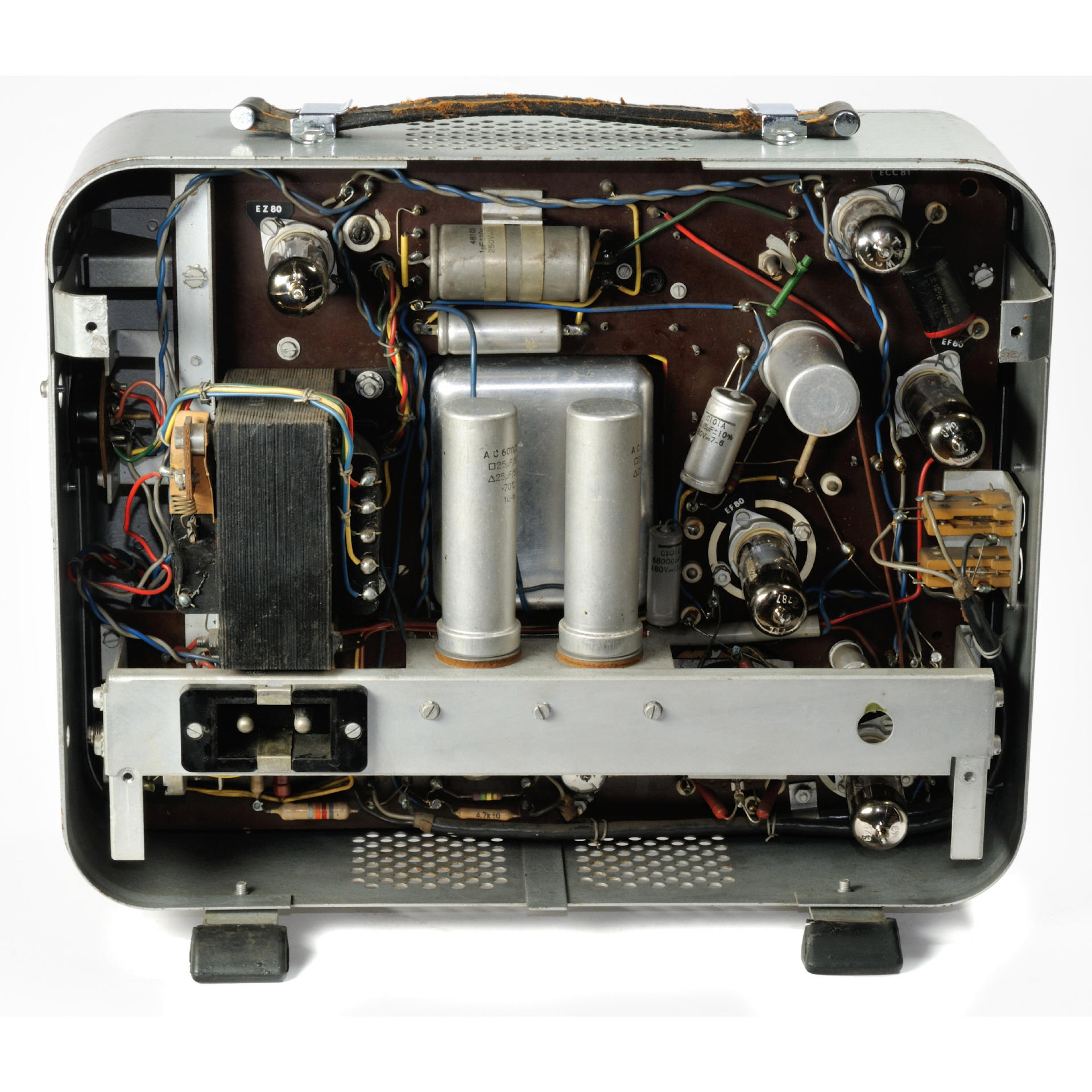 Röhren: 3 x EF80, ECC81, EB91, EZ80, 85A2 (alle Röhrensockel sind beschriftet) weitere Halbleiter: 4 x OA70 |