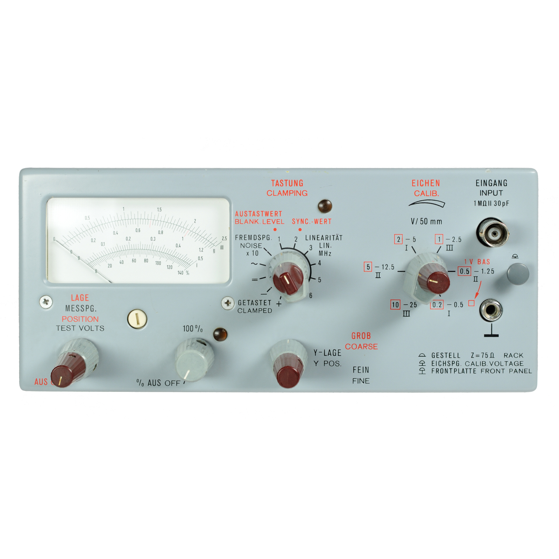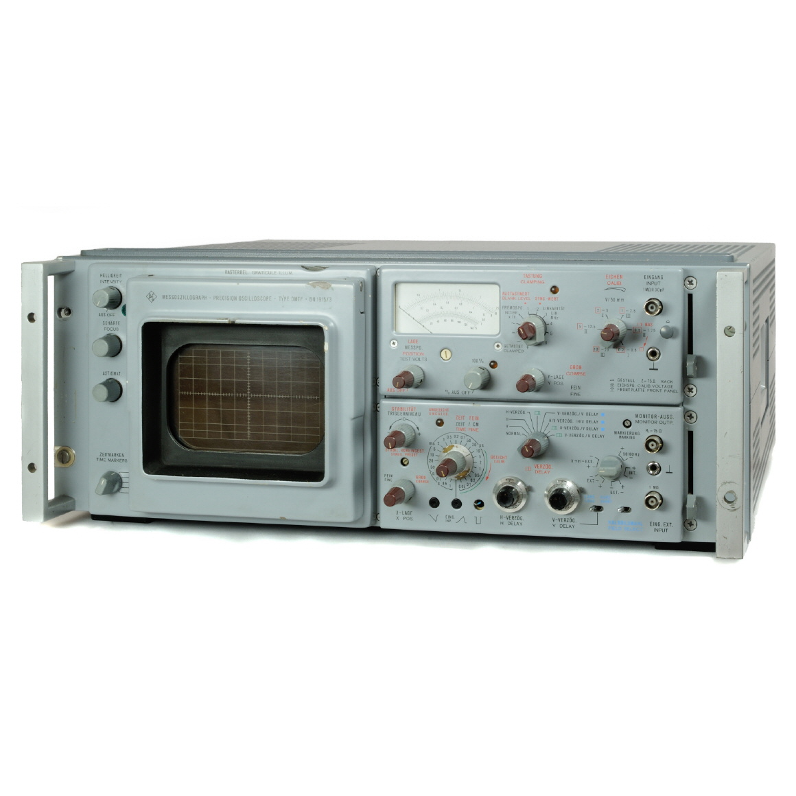 Zeiteinschub BN 191514. Erweiterung der vorgenannten Eigenschaften durch Kippverzögerung, gesteuert über V- und H-Impulse, mit deren Hilfe auch beliebige Ausschnitte mit maximaler Zeitauflösung innerhalb einer Zeile eines Fernsehbildes dargestellt werden können. Zur Auswertung von Prüfzeilen ist für die Kippverzögerung, ausgelöst durch V-Impulse, ein spezieller Verzögerungsbereich vorgesehen. Überschreibungen durch Doppelauslösung innerhalb einer oder zweier Zeilen ermöglichen ein optimales Messen von Impuls-Sprung-Signalen. Zusätzlich ist auch eine Überschreibung der Prüfzeilen eines Halbbildes mit den korrespondierenden Prüfzeilen des anderen Halbbildes mit getrennt einstellbaren Verzögerungszeiten vorgesehen. Automatische Voreinstellung von Trigger-Niveau und Stabilität erleichtern die Bedienung.