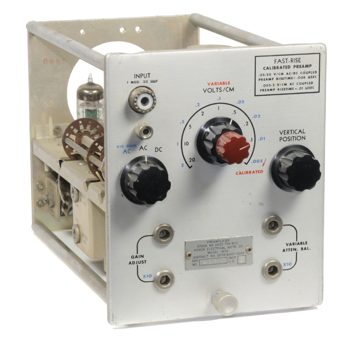 Typenschild auf der Frontplatte: Preamplifier Stock No. 6625-799-8110 Hickok Electrical Instr. Co. Contract No. AF36(600)-13283 Ser. No. 423 Aufkleber auf der Rückseite: Prüfzettel der Bundeswehr, datiert auf 1983 |