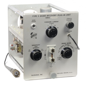 Der Einschub Typ S ist für die Verwendung in Tektronix- Breitband-Oszillografen bestimmt. Die langsame Anstiegszeit der Tektronix-Oszillografen der 530er-Serie verringert die Möglichkeit der S-Einheit, schnelle Halbleiterdioden zu untersuchen. Bei Verwendung des Typs S wird eine Spannung, die an eine Testdiode angelegt wird, auf dem Oszillografen in Funktion der Zeit dargestellt. Gewisse Parameter der Diode, wie Sperrschichtwiderstand, Sperrschichtkapazität und Speicherladung, können von der Darstellung direkt und zuverlässig gemessen werden. Die Arbeitsweise einer Diode in einer spezifischen Schaltung kann durch die Analyse des Einschaltvorgangs und des Übergangsverhaltens bestimmt werden. Da der Einschub im Wesentlichen für die Aufnahme von Spannungskennlinien bei konstantem Strom durch ein Element dient, kann er auch für andere Anwendungen dienen, zum Beispiel: Untersuchung von Kennlinien der Transistoren oder Messung des Widerstands, der Kapazität oder der Induktivität eines Bauelementes. Mit dem Einschub Typ S lassen sich Durchlassströme in 5 geeichten Stufen von 1 ... 20 mA und Sperrströme in 6 geeichten Stufen von 0...2mA einstellen. Die Parallelkapazität zur Diode ist 9 pF, und die geeichten Ablenkfaktoren betragen 0,05 V/cm und 0,5 V/cm. |