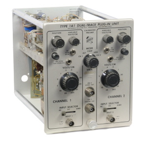 | Der Zweispur-Verstärker-Einschub Typ 1A1 enthält 2 identische geeichte Vorverstärker-Kanäle von hoher Verstärkung und kleiner Anstiegszeit. Der Einschub kann mit allen Tektronix-Oszillografen der Serien 530, 540 oder 550 verwendet werden. | |