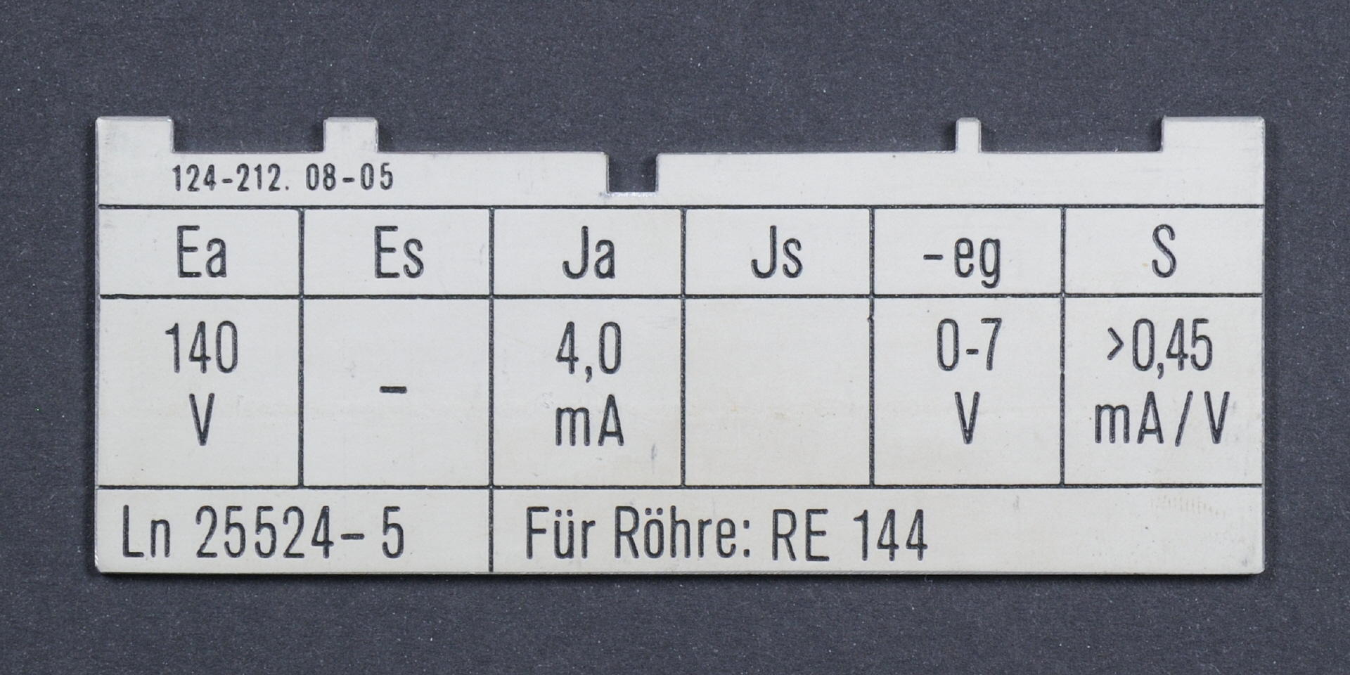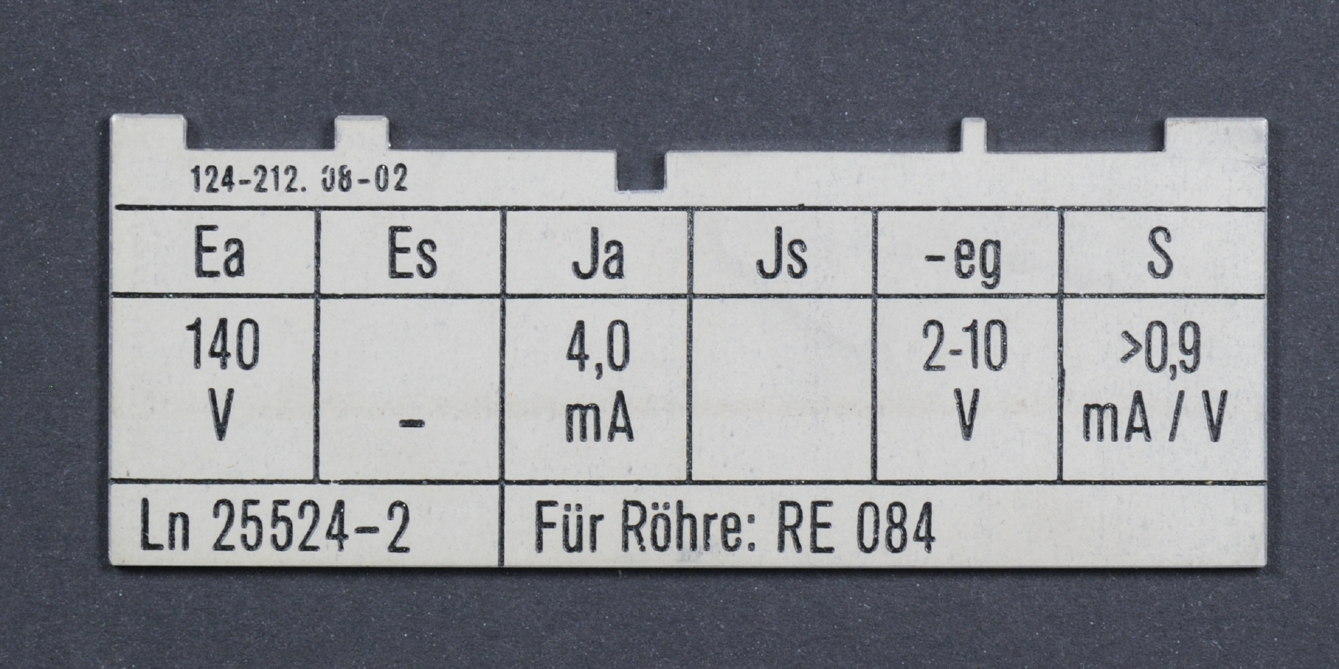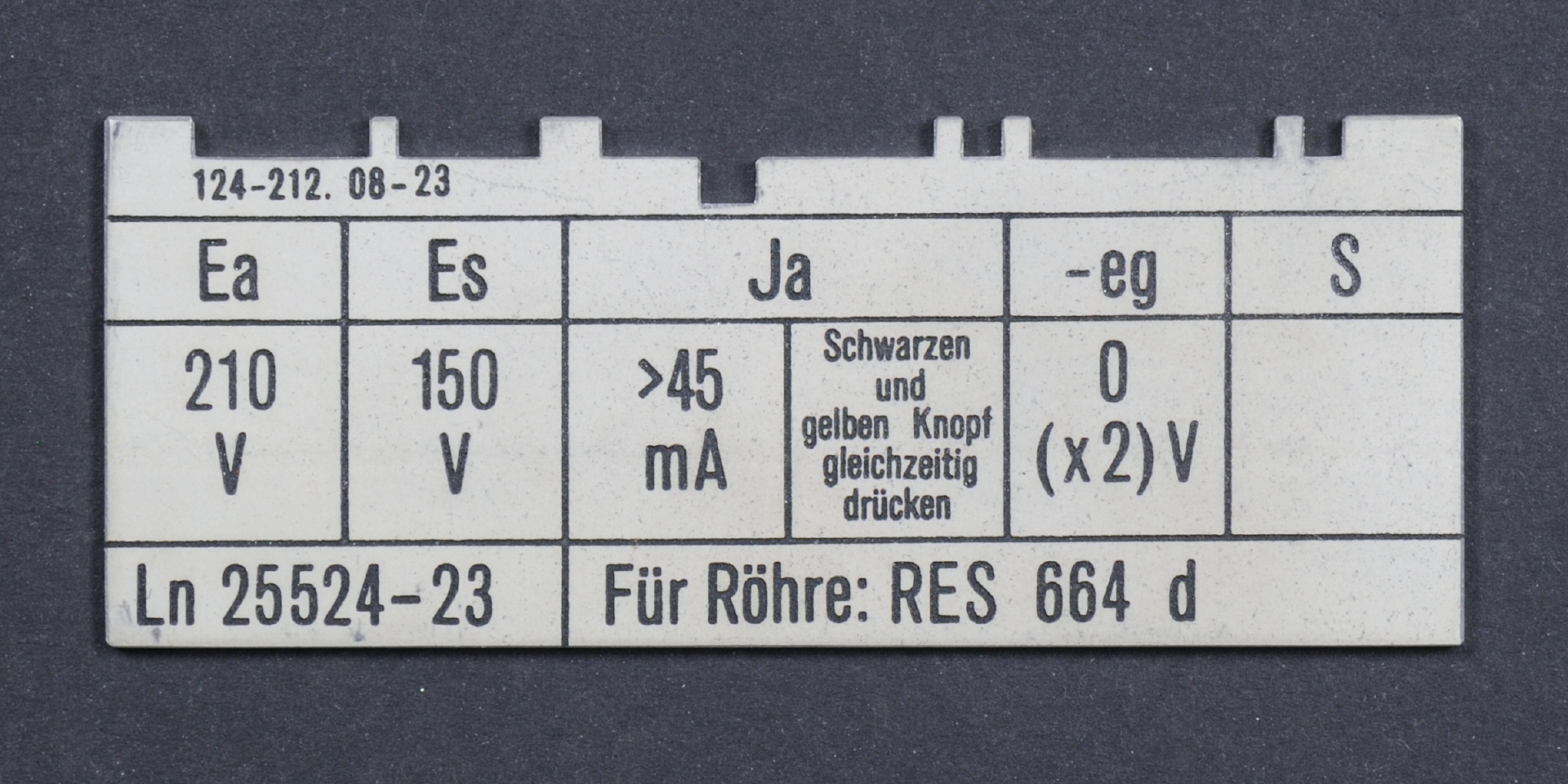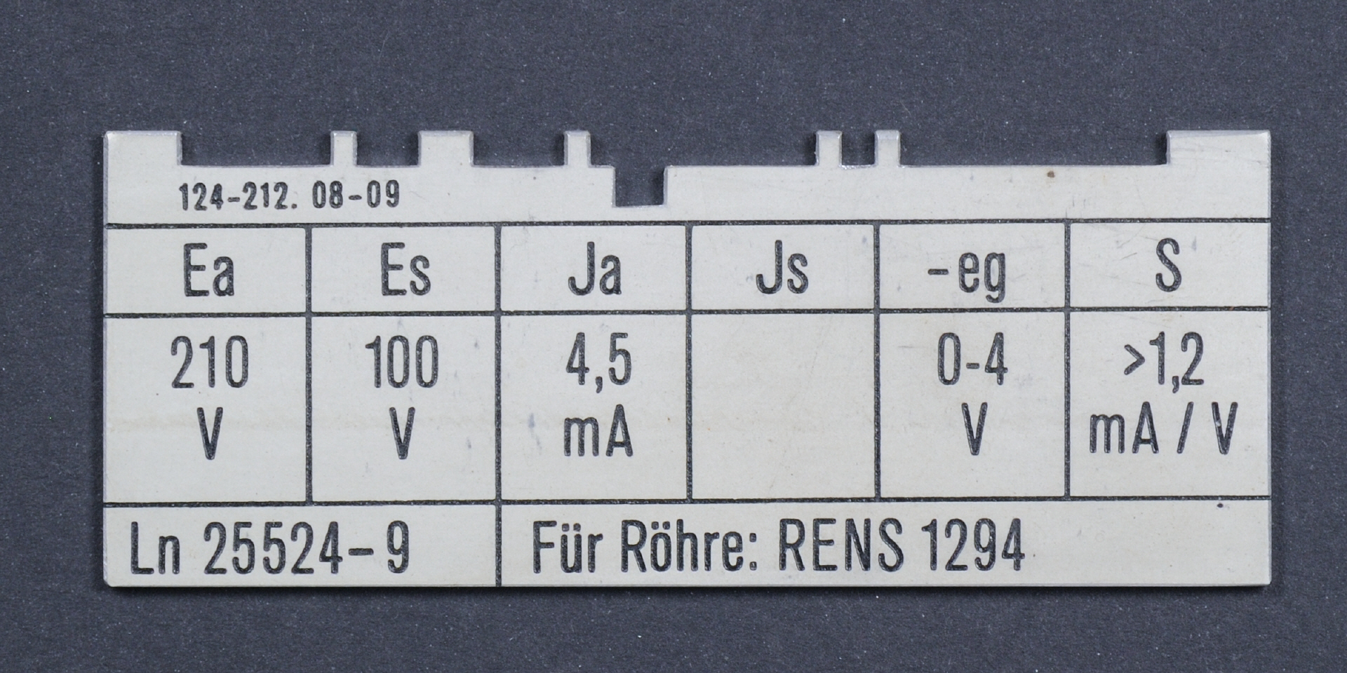 mit dem vorhandenen Schlüsselsatz prüfbare Röhren: RE074, RE084, RES094, RE134, RE144, REN904, RENS1264, RENS1284, RENS1294, CL1, CC2, RV12P2000, NF2, RV12P4000, RV2P800, RGN1064, RS241, RS242, RS242 spez., RL2P3, RES664, RES1664d mit Zusatzkasten 1 messbare Röhren (Zusatzkasten und Schlüssel nicht vorhanden): AA, BA, CA, RL2T2, RL12T2 Gesamtliste aller prüfbaren Röhren mit vollständigem Schlüsselsatz: RE074, RE084, RES094, RE134, RE144, REN904, RENS1264, RENS1284, RENS1294, AA, BA, CA, CL1, CC2, RV12P2000, NF2, RV12P4000, RV2P800, RGN1064, RS241, RS242, RS242 spez., RL2P3, RES664, RES1664d, RES164, AC2, RL2T2, RL12T2, RE084K |