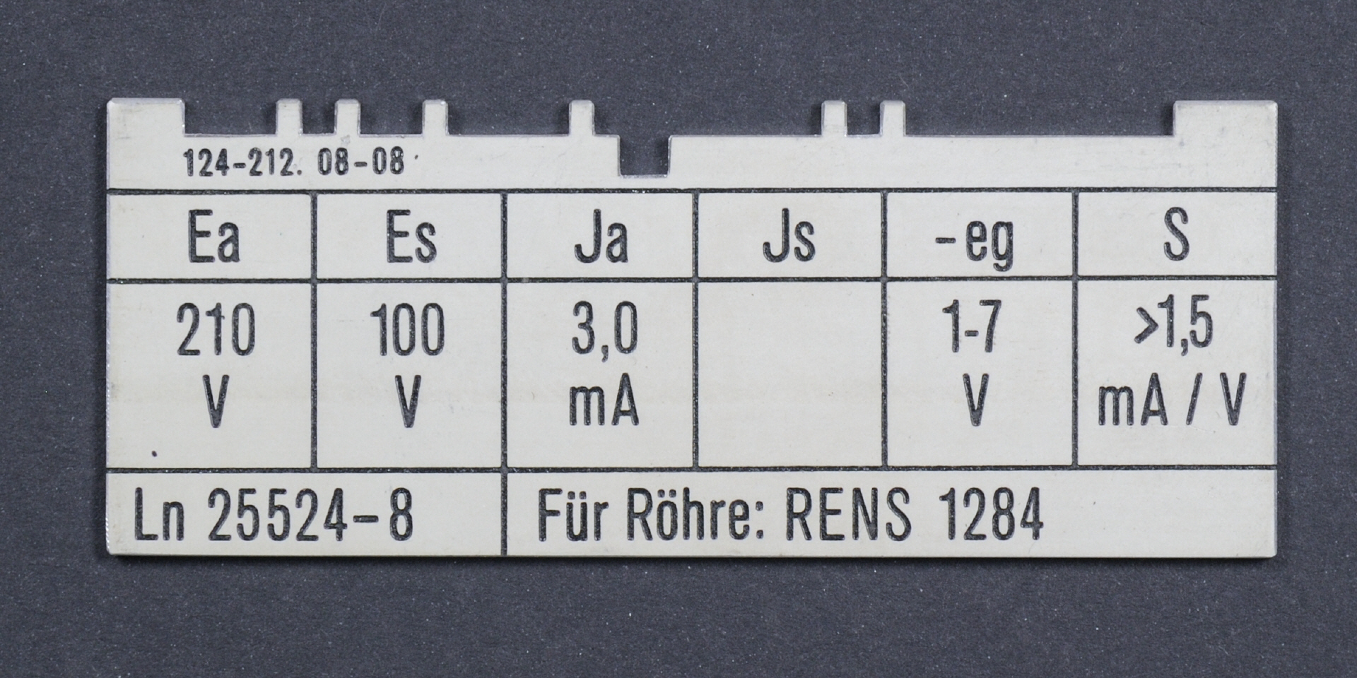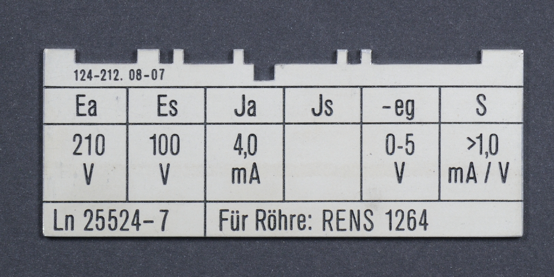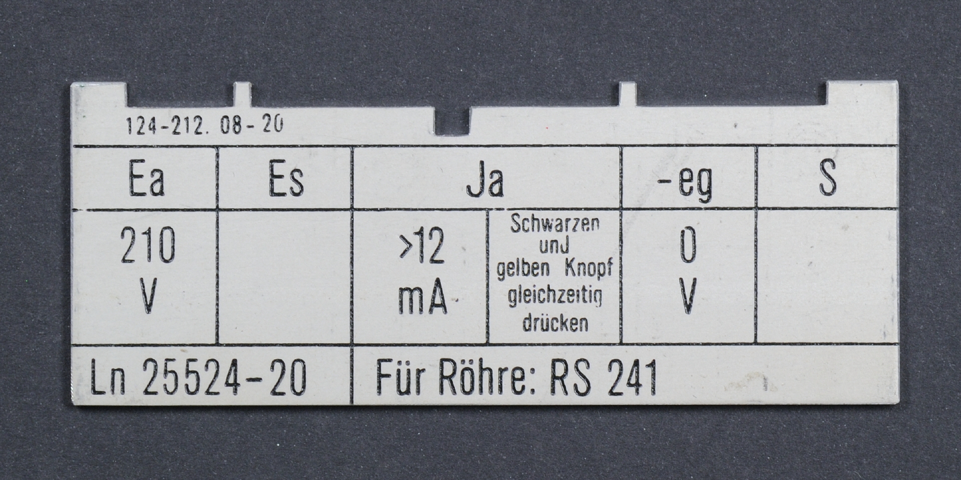 mit dem vorhandenen Schlüsselsatz prüfbare Röhren: RE074, RE084, RES094, RE134, RE144, REN904, RENS1264, RENS1284, RENS1294, CL1, CC2, RV12P2000, NF2, RV12P4000, RV2P800, RGN1064, RS241, RS242, RS242 spez., RL2P3, RES664, RES1664d mit Zusatzkasten 1 messbare Röhren (Zusatzkasten und Schlüssel nicht vorhanden): AA, BA, CA, RL2T2, RL12T2 Gesamtliste aller prüfbaren Röhren mit vollständigem Schlüsselsatz: RE074, RE084, RES094, RE134, RE144, REN904, RENS1264, RENS1284, RENS1294, AA, BA, CA, CL1, CC2, RV12P2000, NF2, RV12P4000, RV2P800, RGN1064, RS241, RS242, RS242 spez., RL2P3, RES664, RES1664d, RES164, AC2, RL2T2, RL12T2, RE084K |