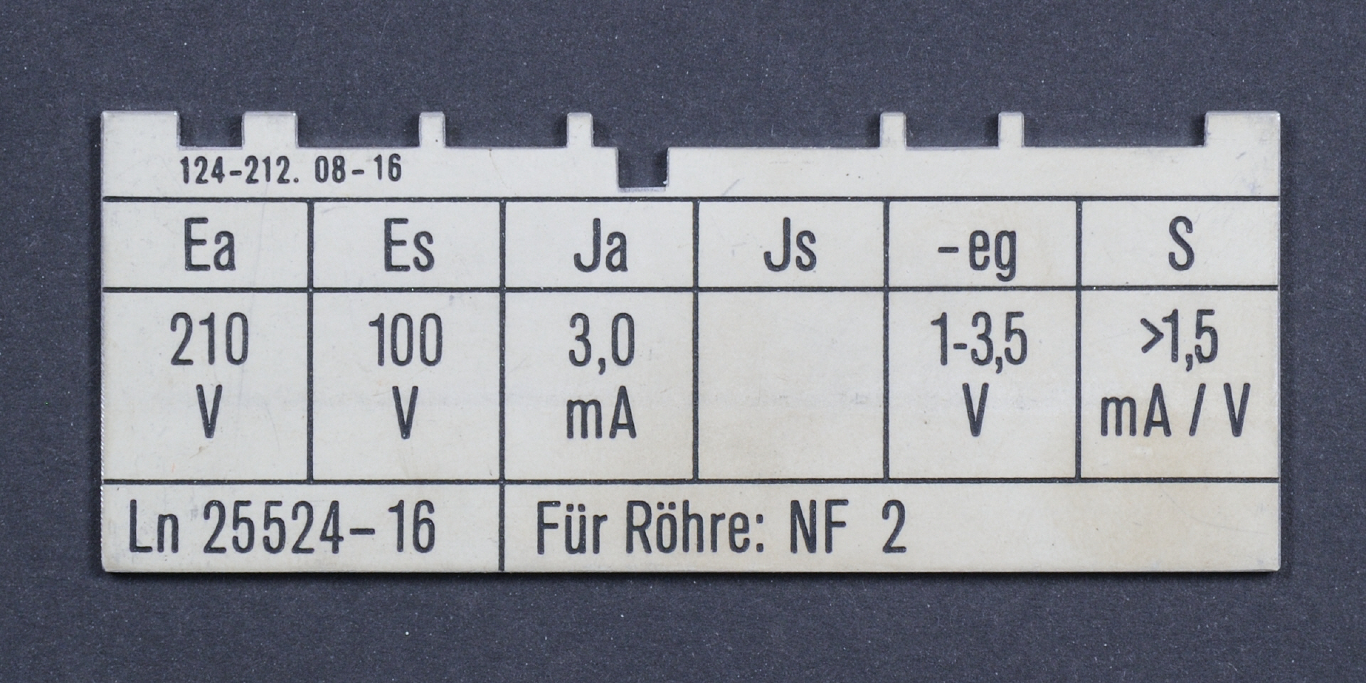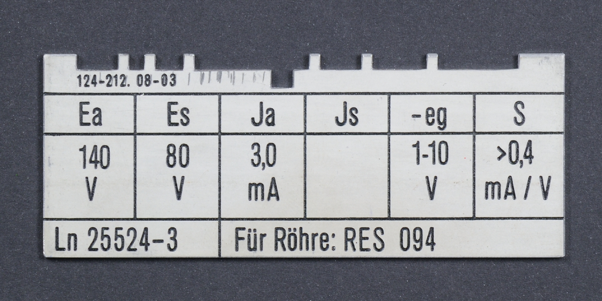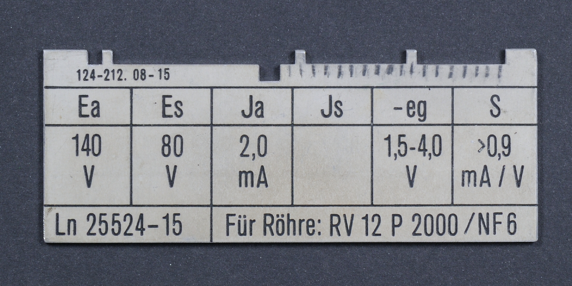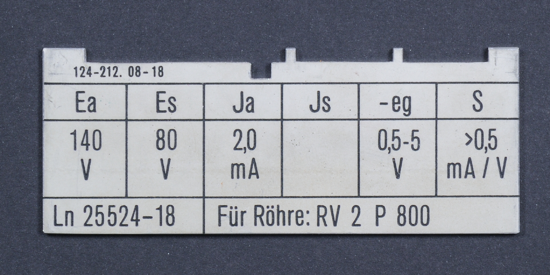 mit dem vorhandenen Schlüsselsatz prüfbare Röhren: RE074, RE084, RES094, RE134, RE144, REN904, RENS1264, RENS1284, RENS1294, CL1, CC2, RV12P2000, NF2, RV12P4000, RV2P800, RGN1064, RS241, RS242, RS242 spez., RL2P3, RES664, RES1664d mit Zusatzkasten 1 messbare Röhren (Zusatzkasten und Schlüssel nicht vorhanden): AA, BA, CA, RL2T2, RL12T2 Gesamtliste aller prüfbaren Röhren mit vollständigem Schlüsselsatz: RE074, RE084, RES094, RE134, RE144, REN904, RENS1264, RENS1284, RENS1294, AA, BA, CA, CL1, CC2, RV12P2000, NF2, RV12P4000, RV2P800, RGN1064, RS241, RS242, RS242 spez., RL2P3, RES664, RES1664d, RES164, AC2, RL2T2, RL12T2, RE084K |