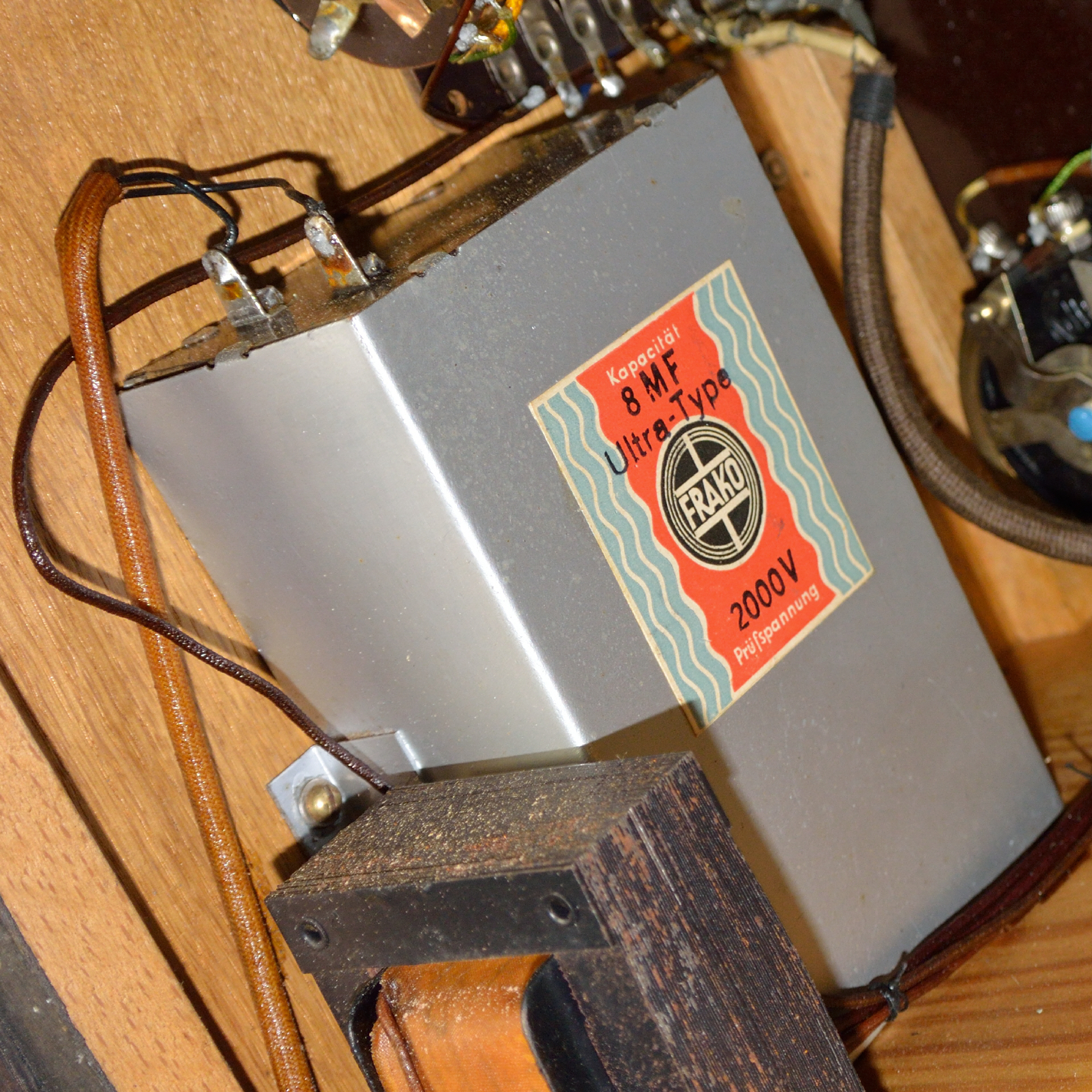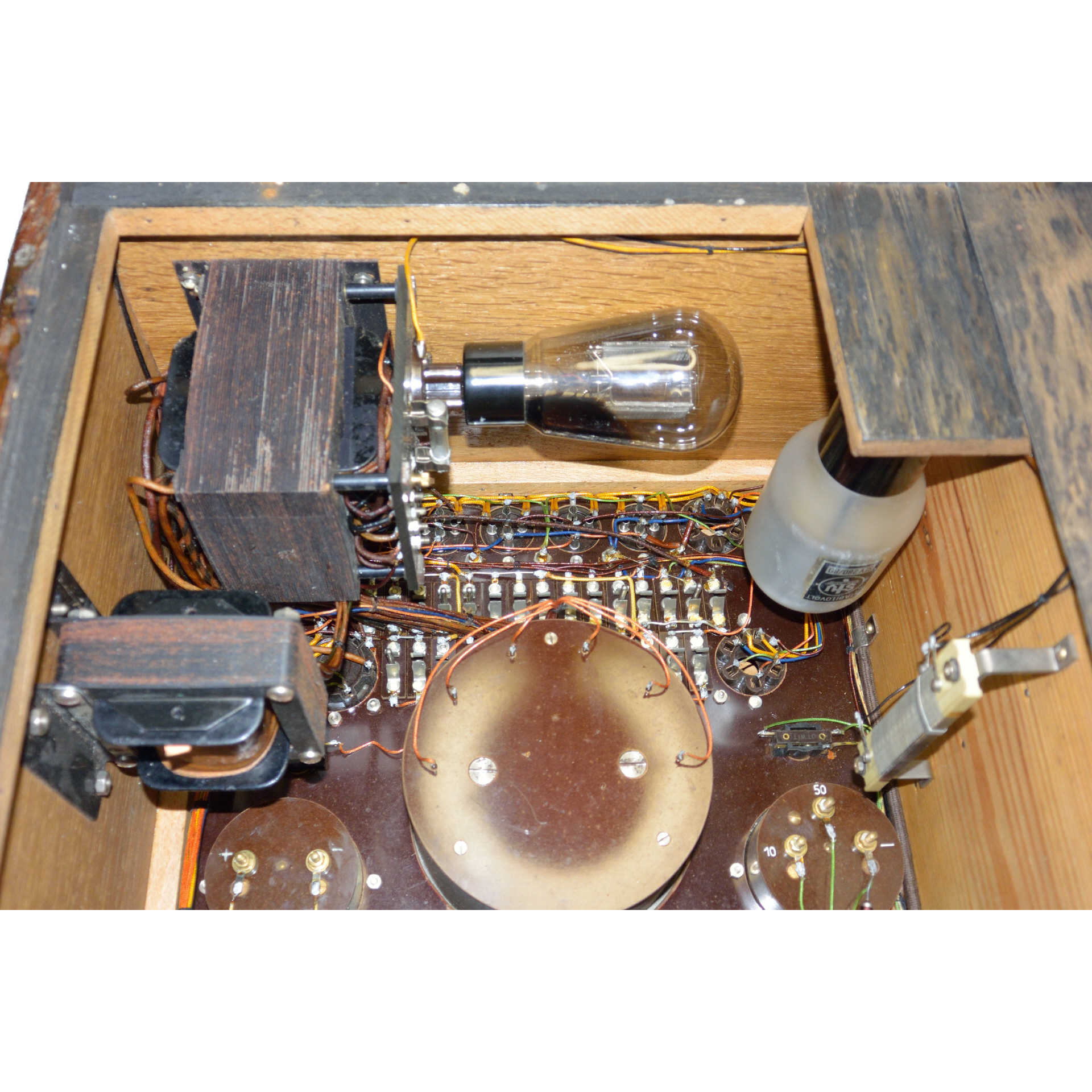 11 Röhrenfassungen sind verbaut: 4 x Europa 3/4/5 pol. 1 x Außenkontakt klein 2 x Außenkontakt groß 3 x Hexodenfassung 1 x Europa 5+1 pol. |