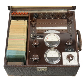 Karten / Kartensätze: Der gesamte Prüfkartensatz, für das Modell W 10, umfasst (Stand von 1940) folgende Nummern: Karte 1 —143 = normale Karten, die zu jedem Gerat mitgeliefert wurden. Karte 144—164 = Loewe Spezialröhren (Mehrfachröhren usw. mit besonderen Sockelarten), zu deren Prüfung die Loewe-Zusatzeinrichtung gehört. Karte 165—208 = normaler Kartensatz. Karte 209—216 = gibt es nicht Karte 210—318 = normaler Kartensatz. Karte 319—399 = gibt es zur Zeit noch nicht; bei Neuerscheinungen werden diese Nummern noch beseht. Karte 400—499 = sind aus technischen Gründen für Ihr Modell nicht lieferbar. Karte 500— z. Zt. 732 = Amerikaner Röhrentypen, die nur mit der Amerika-Zusatzeinrichtung prüfbar sind.