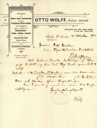 Dem Katalog No. IV lag ein Brief von Otto Wolff bei - ein Anschreiben über die Lieferung eines Widerstandskastens an Herrn Prof. Paschen, Physikalisches Institut Tübingen vom 15.10.1910.