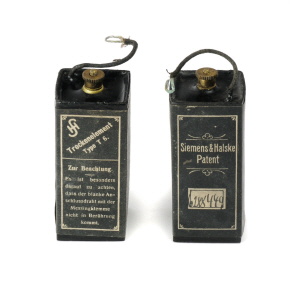 Galvanische Trockenelemente haben vor den mit Flüssigkeiten gefüllten (nassen) Elementen mehrfache Vorzüge; sie sind leicht und bequem zu handhaben und zu transportieren, jederzeit fertig zum Gebrauch und bedürfen bis zur vollständigen Ausnutzung keinerlei Wartung. Sie eignen sich besonders zur Telegraphie, Telephonie und ähnlichen Zwecken, bei welchen nur Schließungen auf kürzere Zeiträume vorkommen, und zeichnen sich dabei wegen ihres großen Regenerationsvermögens durch langdauernde Leistungsfähigkeit aus. Einige derselben können auch stärkere Ströme auf längere Zeit liefern und sind daher im stande, die Elemente von Leclanché und Meidinger zu ersetzen. In den Trockenelementen befindet sich statt der Flüssigkeit eine mit Lösungen von Elektrolyten durchtränkte, mehr oder weniger erhärtete Füllmasse, zu deren Herstellung Gips, Kalkhydrat, Kreide, Thon, gewisse Silikate etc. verwendet werden. Das von Beetz als Normalelement für Laboratoriumszwecke angegebene trockne Daniell-Element wird hergestellt, indem ein Gipsguß mit Zinksulfatlösung und ein solcher mit Kupfersulfatlösung je in die beiden Schenkel eines U-förmigen Glasrohrs eingegossen und in den erstern ein Zinkdraht, in den letztern ein Kupferdraht gesteckt wird, welche nach Erhärtung der Gipsmasse in derselben festgehalten werden. Bei den für praktische Zwecke unter Patentschutz in den Handel gebrachten Trockenelementen wird die Zusammensetzung der Füllmasse meist geheimgehalten. Die äußere Umhüllung aus Zink bildet bei einigen zugleich die eine Elektrode, die andre Elektrode besteht aus Retortenkohle. Die in Deutschland gangbarsten Trockenelemente sind die von Hellesen (G. Wehr, Berlin), Bender (Alb. Schulte, Berlin), das Element Thor (Siegling u. Angerstein, Berlin), Gaßner (Karl Gigot, Frankfurt), Jenisch (Jenisch u. Böhmer, Berlin) und das Regenerativ-Trockenelement von Wolfschmidt u. Brehm (Berlin).