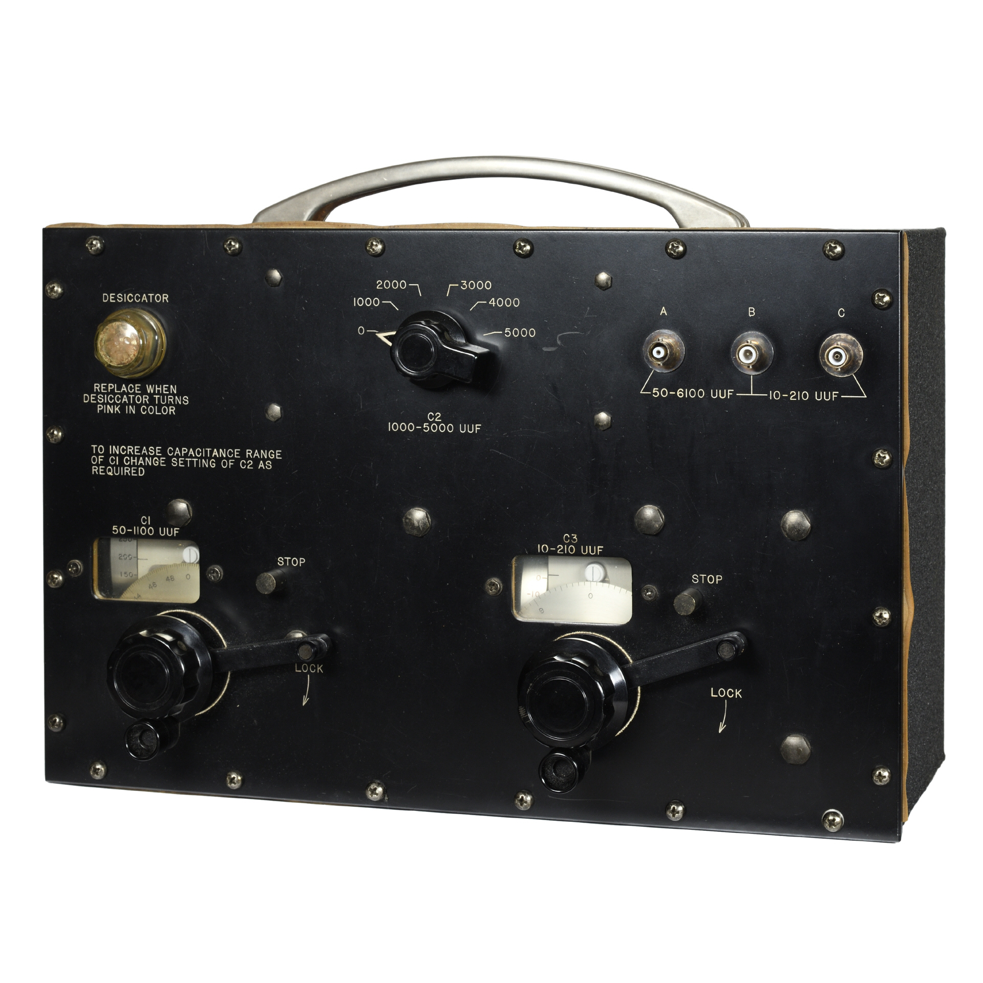 Die Kondensatoren C1 (50-1100 pF) und C2 (Stufen 0 / 1000 / 2000 / 3000 / 4000 / 5000 pF) sind in Serie geschaltet, daher können Werte zwischen 50 und 6100 pF stufenlos eingestellt werden. Der dritte Kondensator C3 hat einen Regelbereich von 10 bis 210 pF.