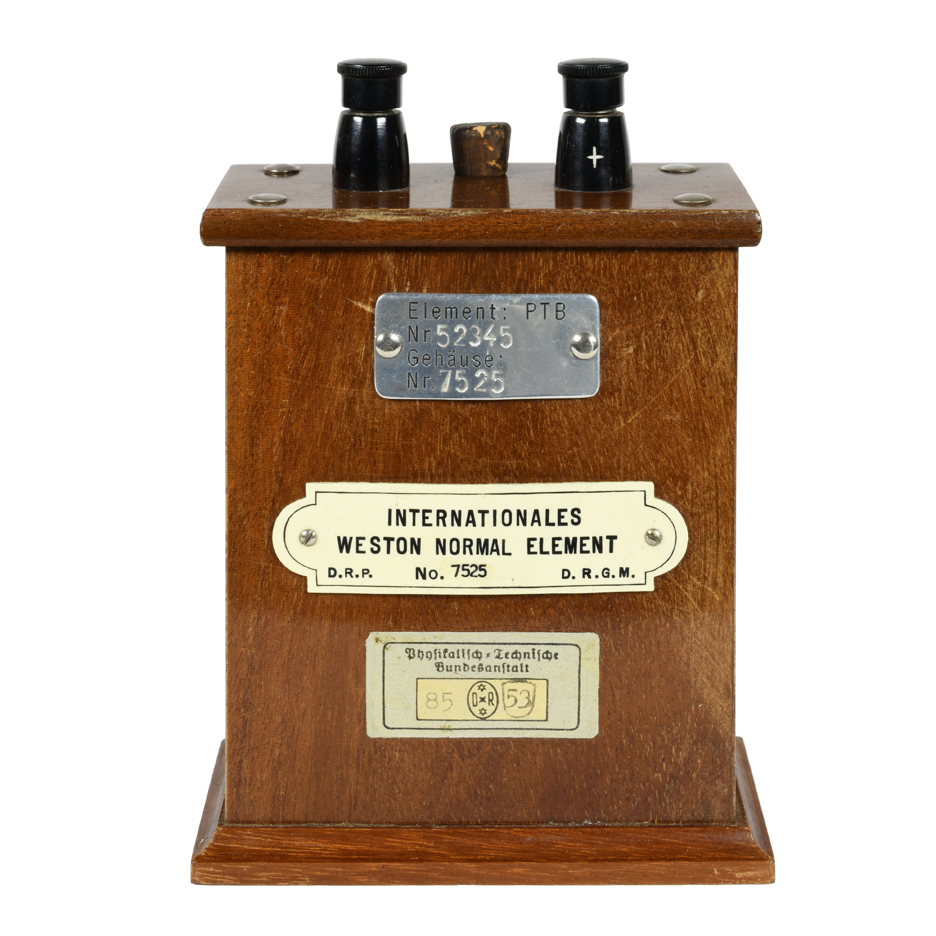 Auf der Rückseite finden sich drei Schilder: Oben: "Element: PTB Nr. 52345 Gehäuse: Nr. 7525" Mitte: "INTERNATIONALES WESTON NORMAL ELEMENT D.R.P. No. 7525 D.R.G.M." Unten: "Physikalische Technische Bundesanstalt" und als Stempel "85" "DR" und "53" (siehe auch Aufnahme weiter unten) |