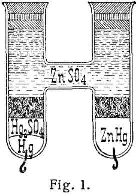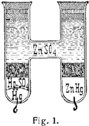 Von einer großen Anzahl zu diesem Zwecke konstruierter Elemente war früher das Normaldaniell am meisten im Gebrauch. Später fand das Quecksilber-Zinkelement, von Latimer Clark 1874 angegeben, mit schwefelsauerm Quecksilberoxydul als Depolarisator und Zinksulfatlösung als Erreger mehr und mehr Eingang, besonders seitdem es von der Physikalisch-Technischen Reichsanstalt eingehenden Untersuchungen unterworfen und zur Beglaubigung zugelassen worden war. Durch diese Untersuchungen wurde festgestellt, welches der genaue Wert der elektromotorischen Kraft des Elements bei einer bestimmten Temperatur ist, in welcher Weise sie von der Temperatur abhängt und welchen Einfluss verunreinigende Beimengungen der Bestandteile auf die elektromotorische Kraft und die Konstanz der Elemente haben. Wegen ihrer leichten Herstellbarkeit kam die von Lord Rayleigh angegebene H-Form in folgender Zusammensetzung zur Anwendung. Der eine Schenkel enthält reines Quecksilber, der andre ein Amalgam von 90 Teilen Quecksilber und 10 Teilen Zink, das heiß eingefüllt und auf dem Boden der Röhre erstarrt ist. Das Quecksilber ist mit einer Paste bedeckt, die durch Zusammenreiben von schwefelsauerm Quecksilberoxydul mit Quecksilber und Zinksulfatkristallen erhalten wird; die benutzten Kristalle werden mit konzentrierter Zinksulfatlösung angefeuchtet, bis ein schwerflüssiger Brei entflieht; von dem Quecksilber ist so viel zu nehmen, dass die Paste nach dem Verreiben mit Quecksilberkügelchen durchsetzt ist. Alsdann werden in beide Röhren einige Zinksulfatkristalle gebracht und die beiden Rohröffnungen nach Einfüllung von konzentrierter Zinksulfatlösung mittels Korkpfropfens und Paraffinaufguß verschlossen. Für die elektromotorische Kraft des Clark-Elements ergab sich als Mittelwert aus einer großen Anzahl von Beobachtungen E = 1,438 Volt bei 15° C. Dieser Wert ändert sich mit der Temperatur, und es ergibt sich für eine zwischen + 10° und + 30° C. gelegene Temperatur t der Temperaturkoeffizient der elektromotorischen Kraft zu – 0,000814 – 0,000007 (t – 15).