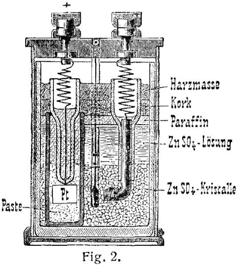 | Beschreibung | Das Element befindet sich in einem Messinggefäß mit Hartgummideckel und Klemmen mit Hartgummikappe und enthält ein beglaubigtes Thermometer. Das Element ist beglaubigungsfähig, da es versandfähig ist, ohne Gefahr, dass das Zink mit dem Quecksilber in Berührung kommen kann, da sich das Quecksilber in einer besonderen Tonzelle befindet. |