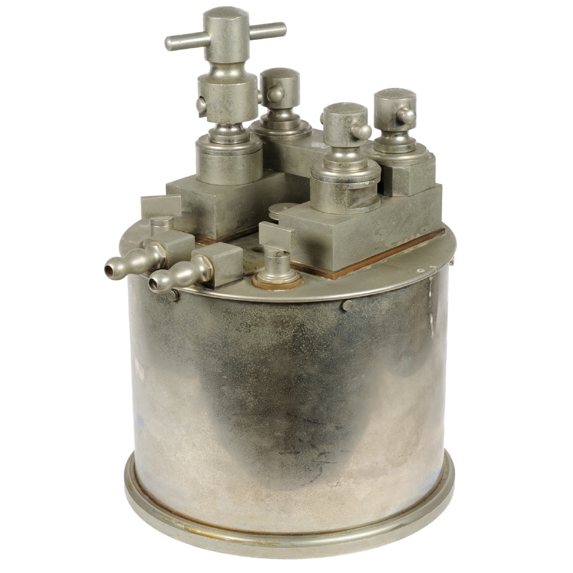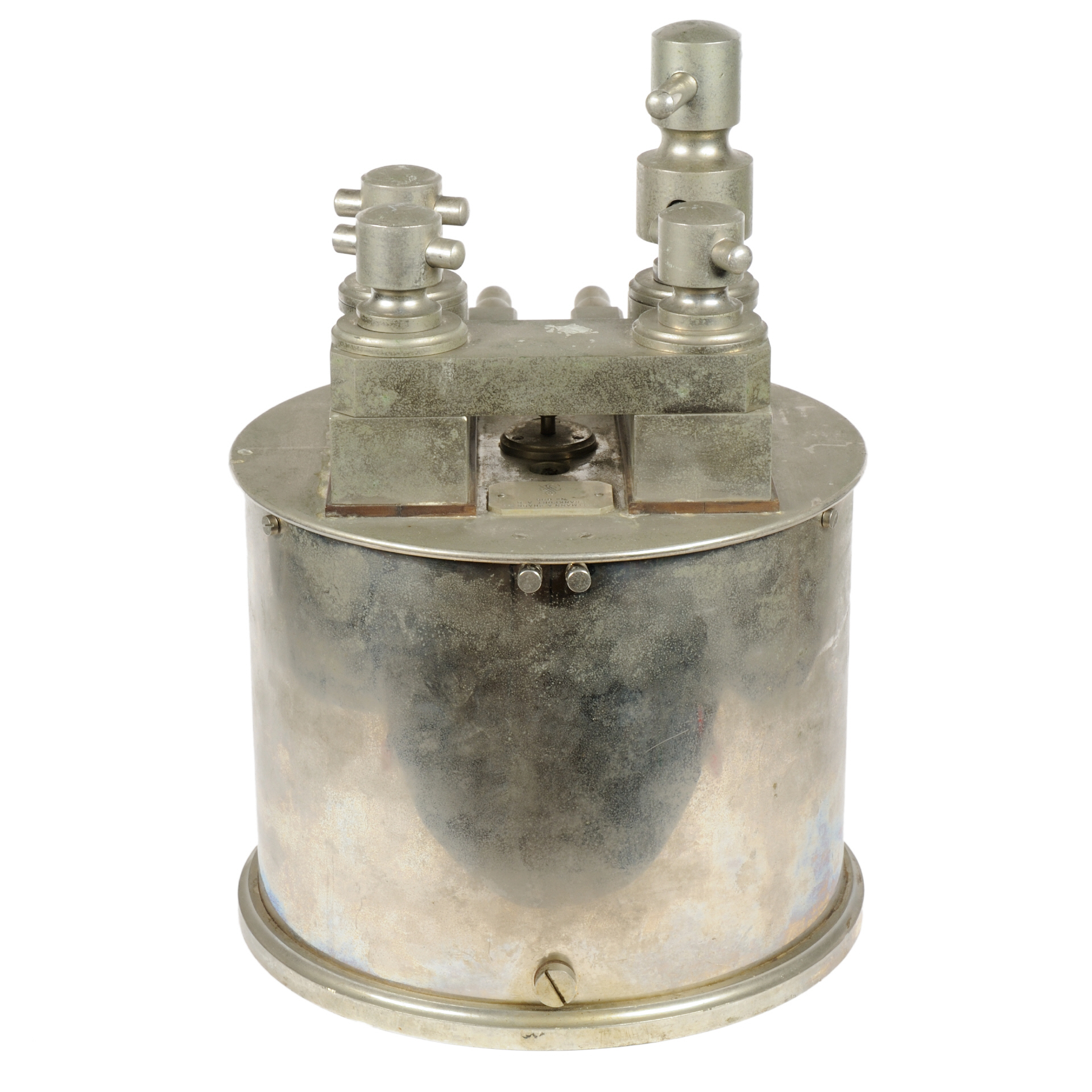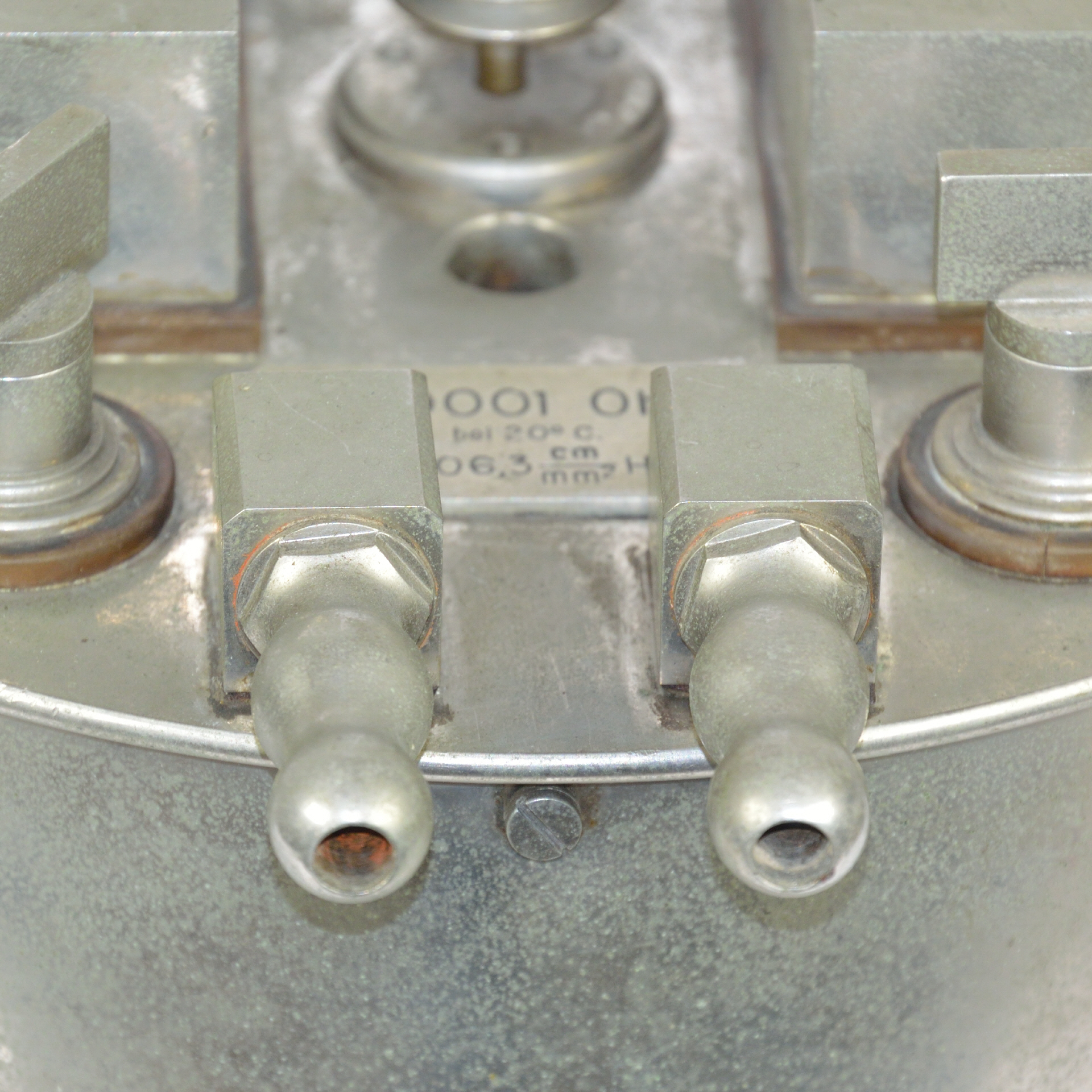 Der Widerstand, gefertigt aus mehreren parallel geschalteter Manganin-Bleche befindet sich im inneren eines großen, topfförmigen Gehäuses aus einer Nickel-Legierung. Rund um die Widerstandsbleche sind Kühlschlangen gelegt, durch die von außen Wasser zur Kühlung geleitet werden kann. Zusätzlich sitzt mittig ein Rührwerk, das von außen durch einen ELektromotor (nicht vorhanden) angetrieben werden kann, um die Kühlung des Systems zu verbessern. Zum Betrieb wird das Gefäß mit Petrolium, als primärer Kühlflüssigkeit, gefüllt. Das Petrolium kann oben über zwei Öffnungen eingefüllt werden, unten befindet sich auf der Rückseite eine Abflußöffnung, die durch eine Schraube mit Gummidichtung verschlossen ist. Der Stromanschluß erfolgt über zwei große Schraubklemmen (M18 Schrauben, 9,5 cm lang, ca. 0,3 kg). Um den Widerstand zu überbrücken, ist hinter den Schraubklemmen ein Kurzschlußbügel, gefertigt aus einer Nickel-Legierung (145 x 45 x 20 mm, ca. 1 kg). Dieser Bügel ist auch über zwei Schraubklemmen fixiert. Um diese Schraubklemmen festziehen zu können, liegt dem WIderstand ein spezieller Steckschlüssel bei (40 x 75 mm, ca. 0,5 kg), der auf die Schraubklemmen einfach aufgesteckt werden kann. Dieser Schlüssel ist, wie auch alle anderen Metallteile des Geräts, aus einer Nickel-Legierung gefertigt. Mit angeschlossener Zusatzkühlung können mit diesem Widerstand Stromstärken bis 2500 A präzise gemessen werden. |