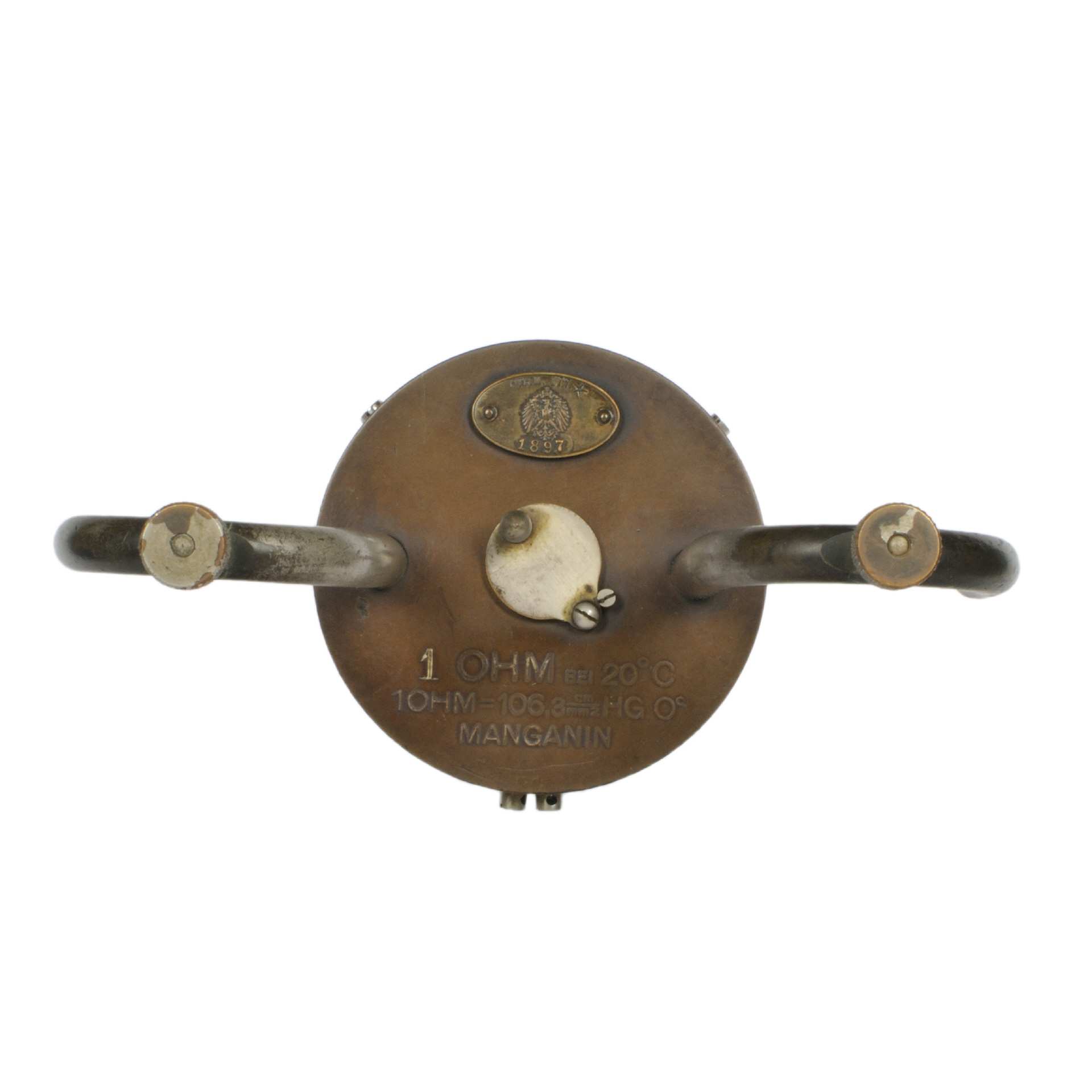 | Beschreibung | Der Widerstand ist mit dem amtlichen Bleisiegel versehen und mit dem Reichsadler, der Beglaubigungsnummer PTR 177/1897, sowie einem Stern als Präzisionswiderstand gestempelt, da er bei der auf ihm angegebenen Temperatur um weniger als 0,001 seines Betrages von dem Sollwert abweicht. |