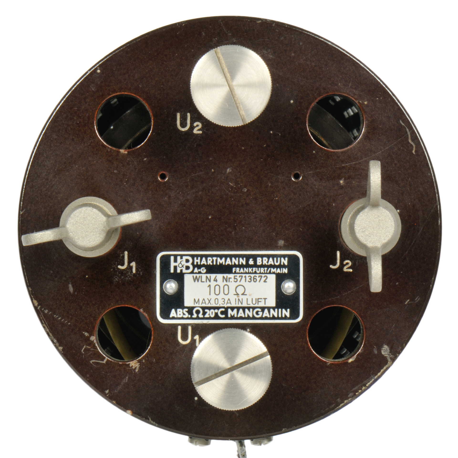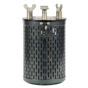 Der Widerstand ist in einem zylindrischen Gehäuse von 104 mm Durchmesser und 150 mm Höhe eingebaut. Der Widerstand ist für den Betrieb in einem Ölbad (Petroleumbad) zur Kühlung ausgelegt. Die obere Deckplatte ist aus Konststoff gefertigt. Im Inneren ist der Widerstandsdraht (Manganin) ist auf einer Messingrohr von 70 mm Durchmesser und 90 mm Länge gewickelt. |