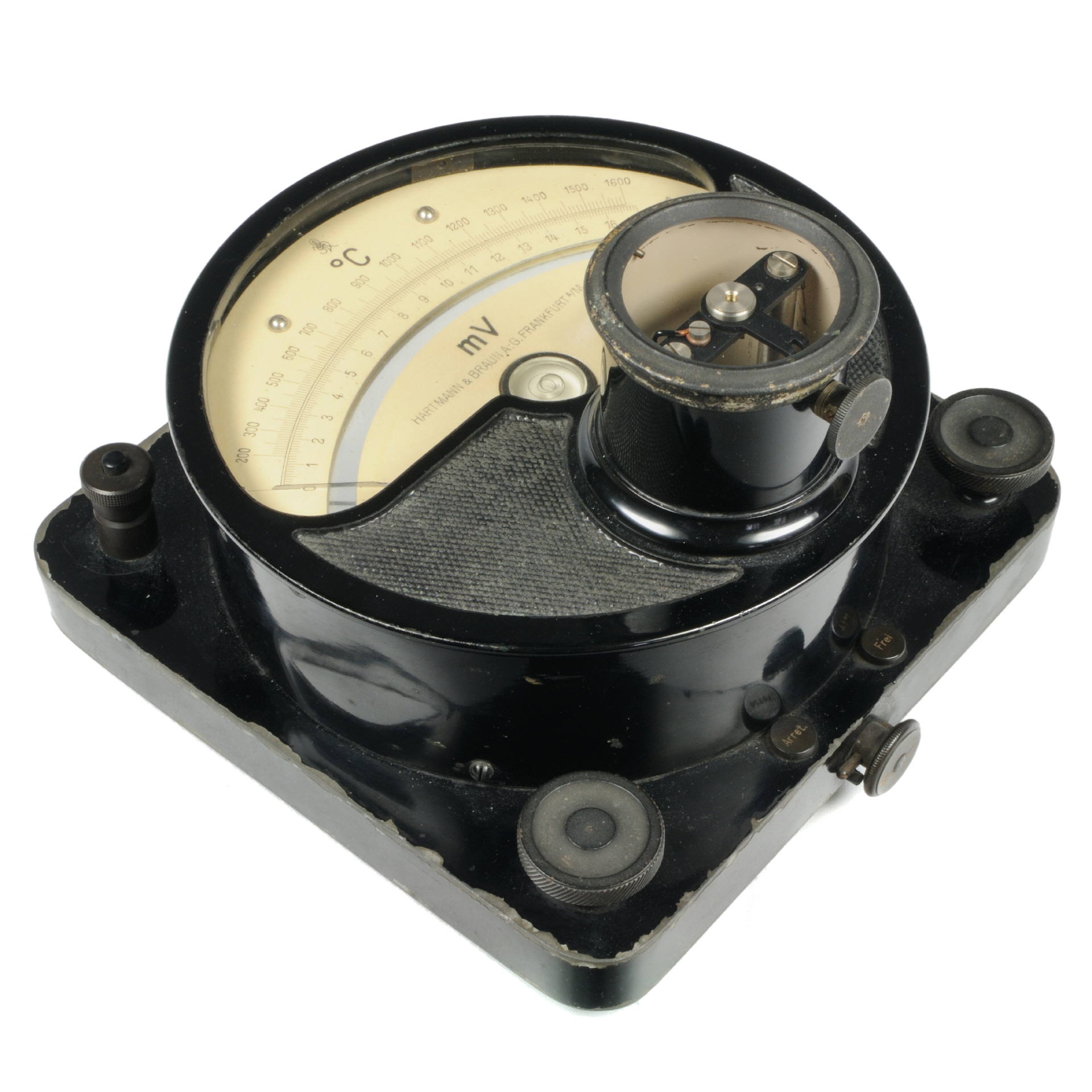 Bei diesem Exponat handelt es sich um ein Zeigergalvanometer. Das Gerät wurde aber nicht zur Strommessung eingesetzt, sondern zur Temperaturanzeige. die Skala besitzt eine Einteilung bis 1600 °C bzw. 17 mV. Der dazu passende Temperatursensor ist leider nicht vorhanden.