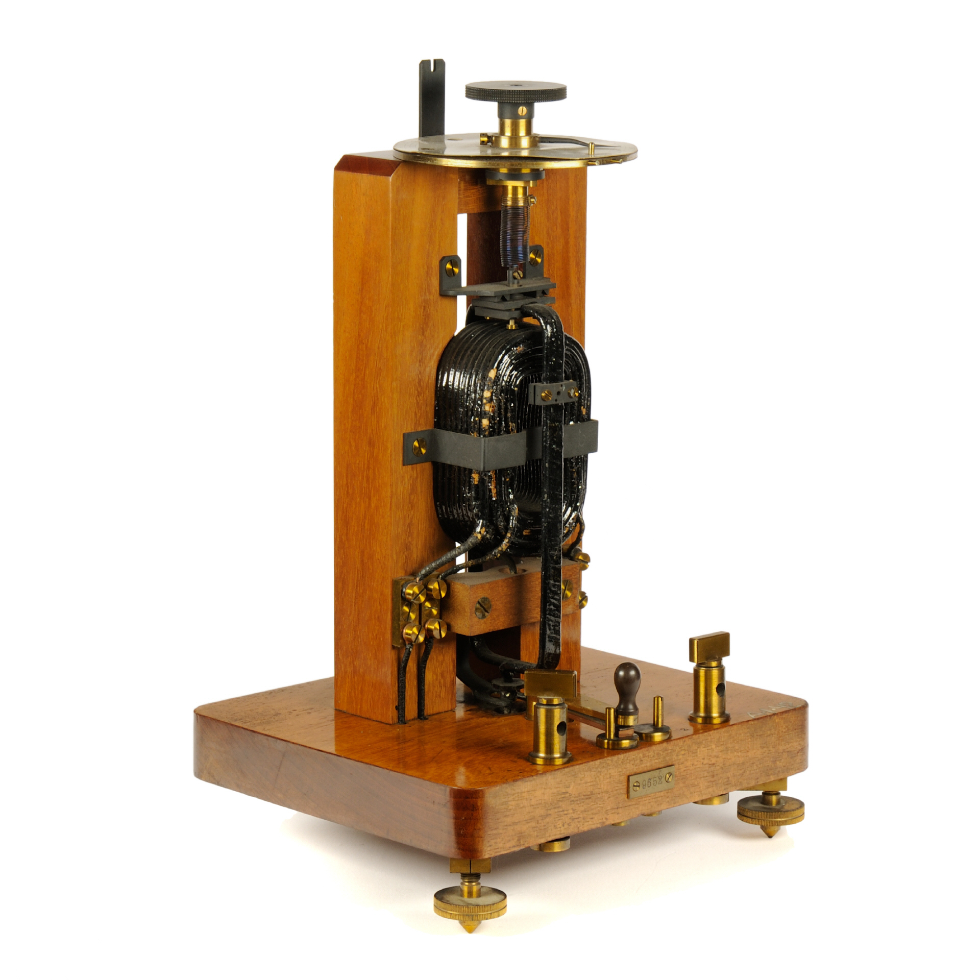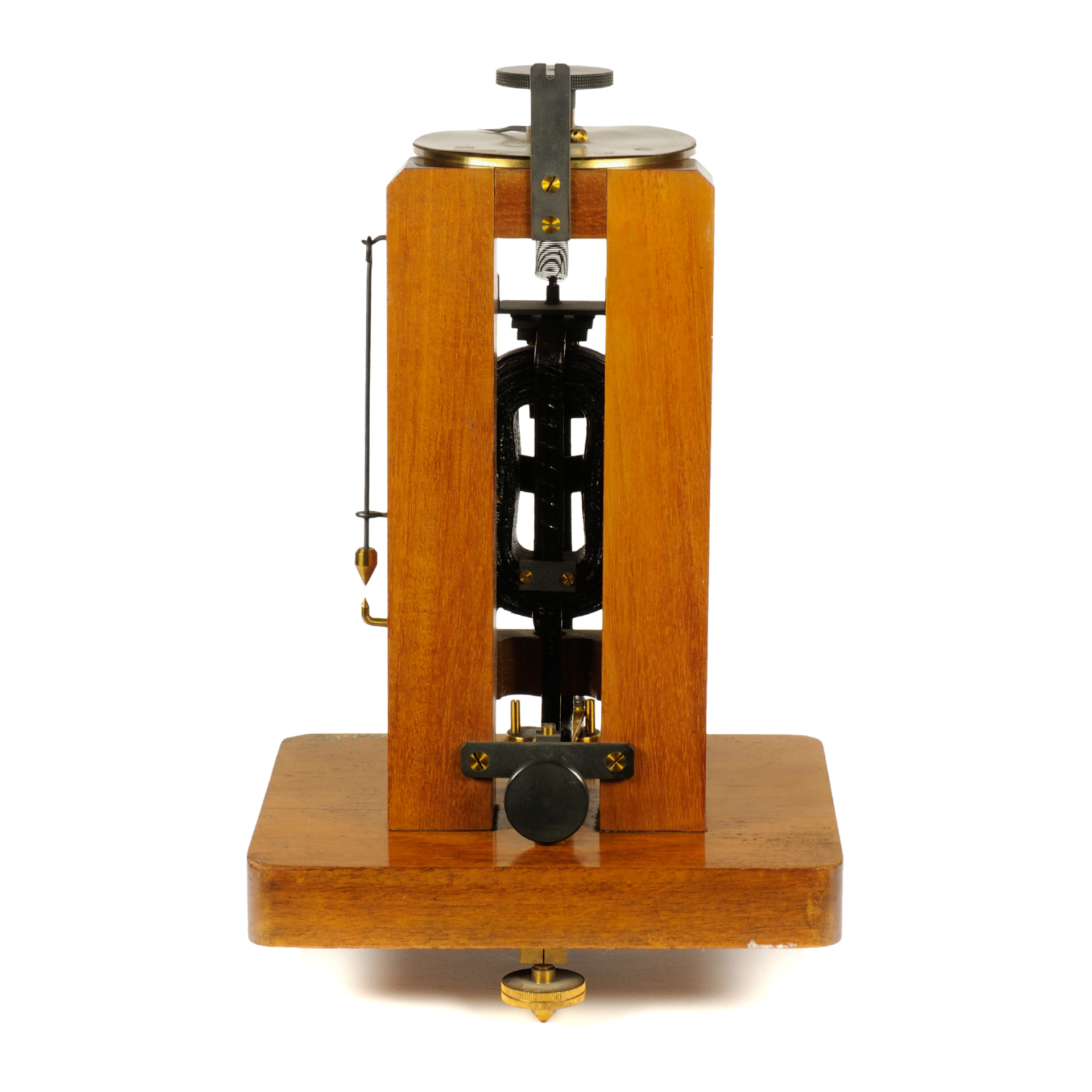Das Messwerk ist auf einer 29 mm dicken Mahagoni-Platte befestigt, die über drei in der höhe verstellbarer Nivellierfüße waagerecht ausgerichtet werden kann. Der Stromanschluß erfolgt über zwei Messing-Klemmen. Das Gerät besitzt zwei feste Spulen, die über den Schalter auf dem Holzsockel umgeschaltet werden kann. Die bewegliche Spule spielt in zwei Quecksilbernäpfen (wobei diese beim Exponat nicht mehr gefüllt sind). Die Arretierung erfolgt über eine Schraube auf der Rückseite des Geräts. |