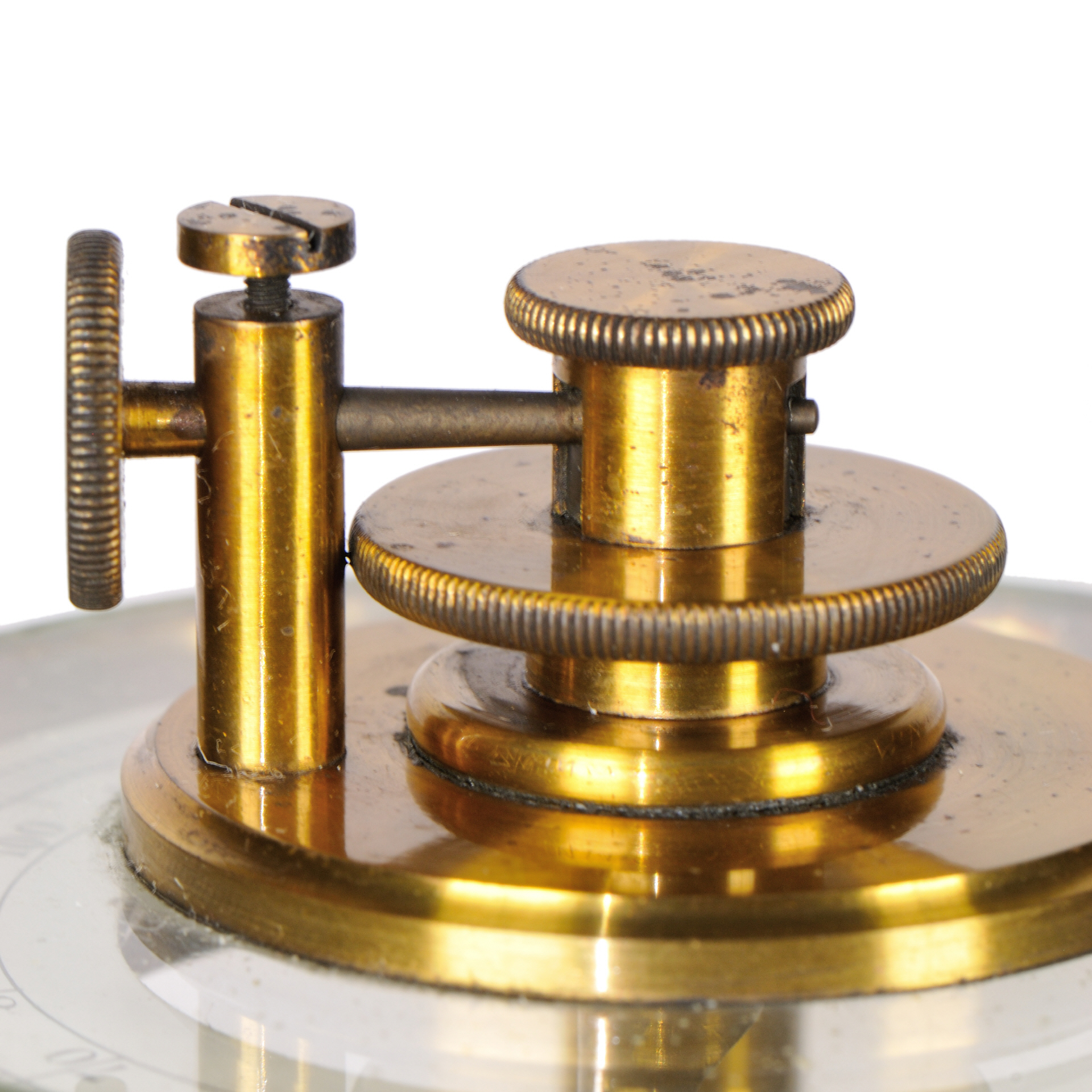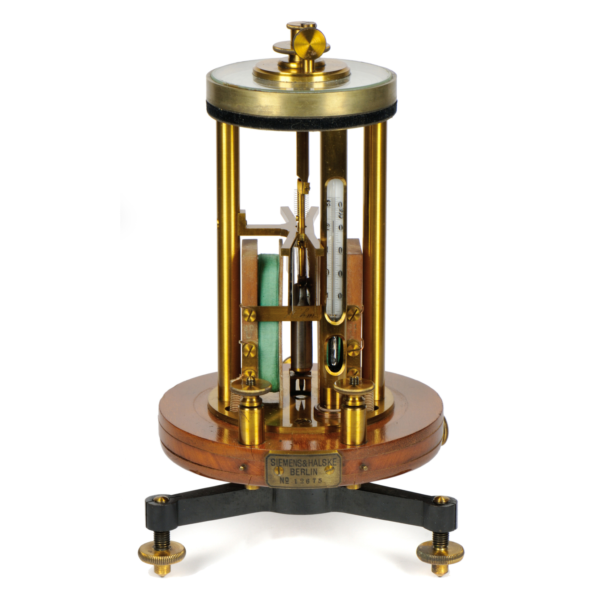 Das gesamte Messwerk ist auf einer runden Messing-Platte aufgebaut, die in einem runden Mahagonisockel eingearbeitet ist. Der Sockel ist auf einem Dreibein-Stativ drehbar montiert, die drei Füße sind höhenverstellbar um das Gerät entsprechend horizontal auszurichten. Über eine Feststellschraube kann das Gerät fixiert werden. Das Messwerk ist durch einen Glaszylinder geschützt, oben findet sich die Skala und die Drehschraube zum verdrehen der Torsionsfeder. Zwischen zwei mit Draht bewickelten, senkrecht aufgestellten Rahmen von 1 Ohm Widerstand ist ein Siemens-Glockenmagnet an Faden und Torsionsfeder aufgehängt. Der Magnet wird durch Luftdämpfung (Glimmerflügel zwischen festen Flächen) rasch beruhigt. Der Glockenmagnet kann über eine Schraube angehoben und arretiert werden (Transportsicherung). Mittig unter dem Magneten ist ein kleiner Metallzylinder mit einer Kreuzmarkierung eingelassen. Diese Markierung dient zur horizontalen Justierung des Geräts - die Spitze des Glockenmagneten muss genau im Zentrum der Markierung sein. Zusätzlich besitzt das hier vorgestellte Exemplar noch ein eingebautes Quecksilber-Thermometer. Damit kann geprüft werden, ob die innere Betriebstemperatur des Geräts im für die Messung optimalen Bereich liegt. Eine ausführliche Beschreibung findet sich in dem Artikel "Über die Messung starker elektrischer Ströme" von Dr. O Frölich, abgedruckt in der Elektrotechnischen Zeitschrift, Jahrgang 1880. Ein im Wortlaut unveränderter Nachdruck findet sich hier. |