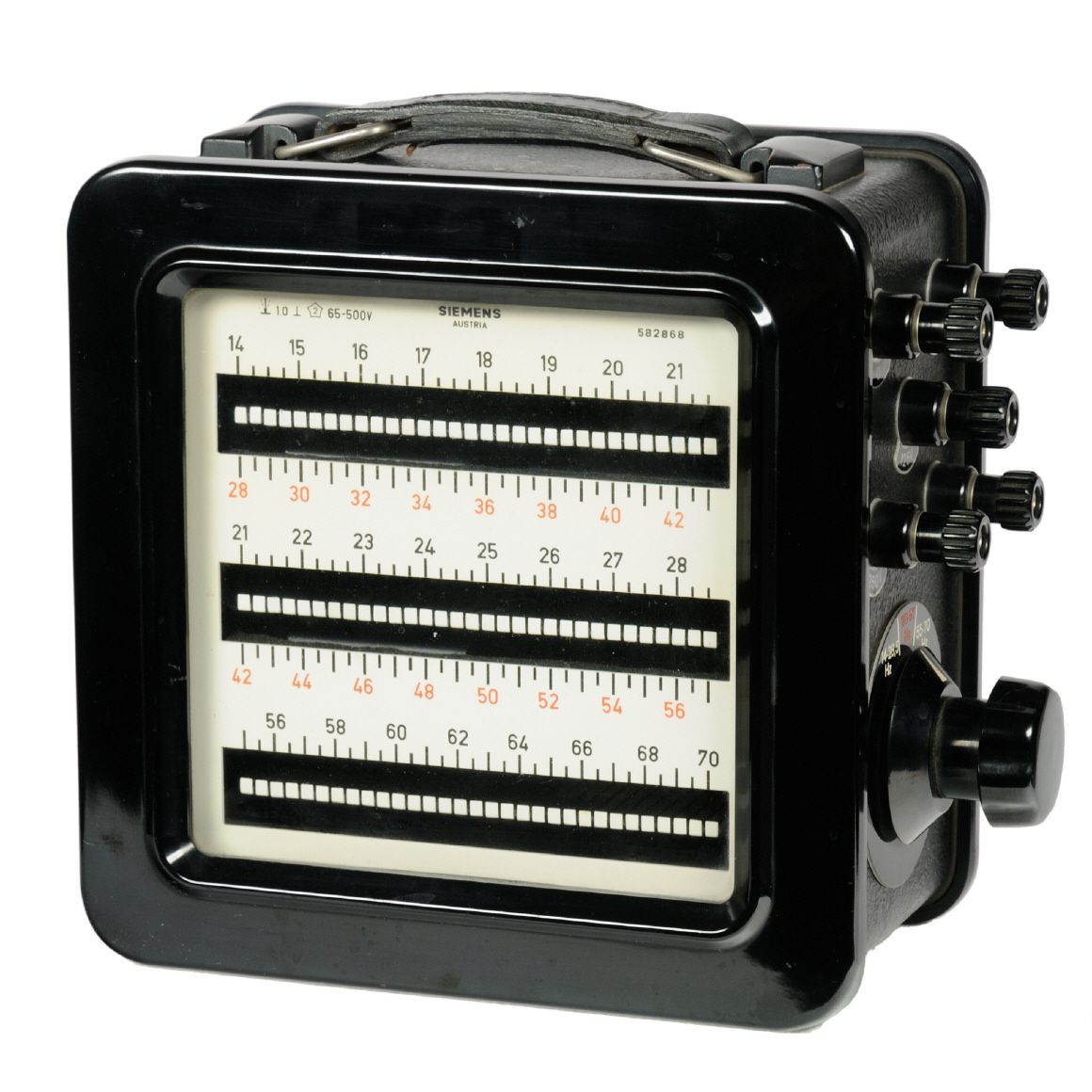 | Beschreibung | Der Zungenfrequenzmesser besitzt drei Zungenreihen, die in einem Standard-Presstoff-Gehäuse mit Tragegriff untergebracht sind. Auf der rechten Seite befinden sich die Anschlussklemmen und der Umschalter für den Frequenzbereich. |