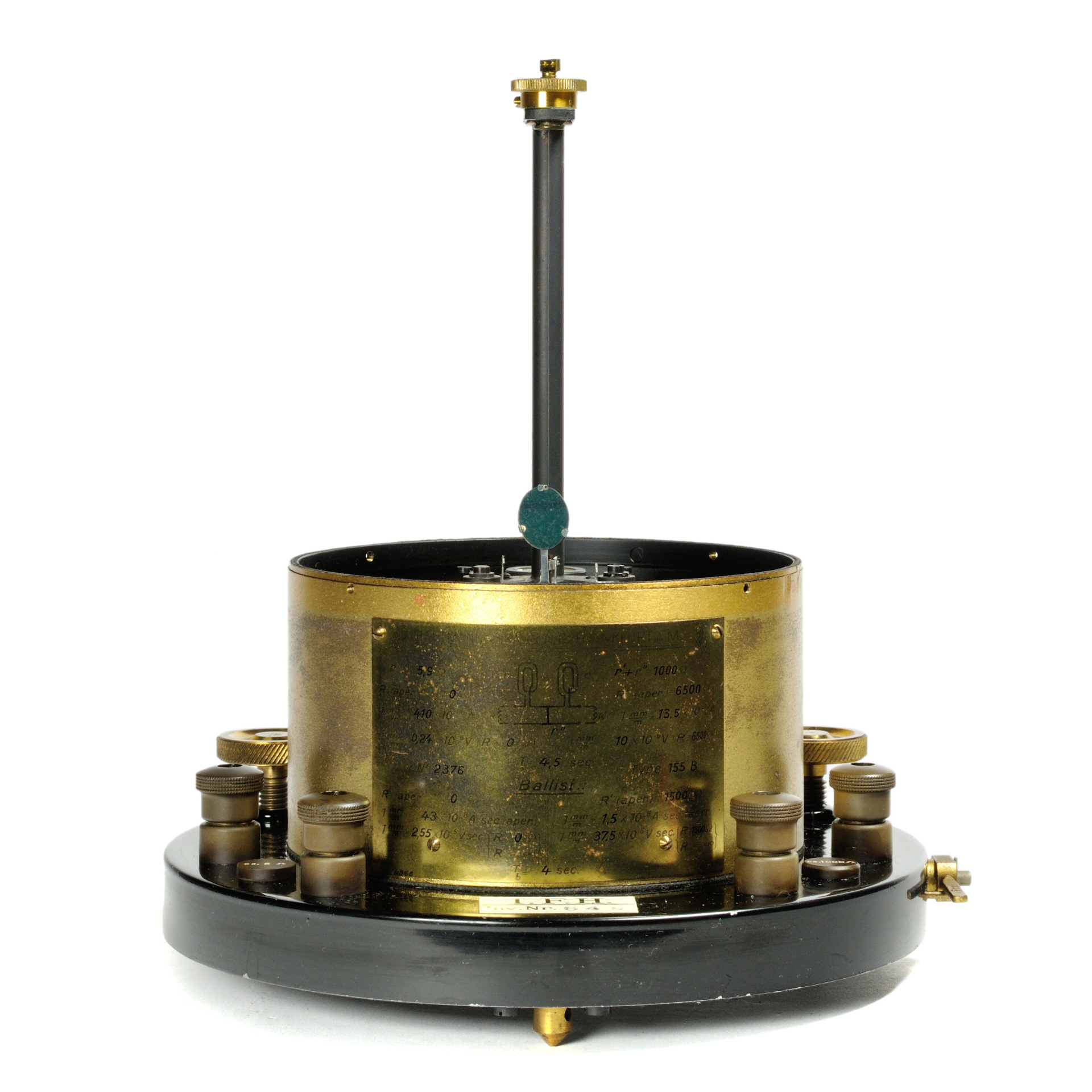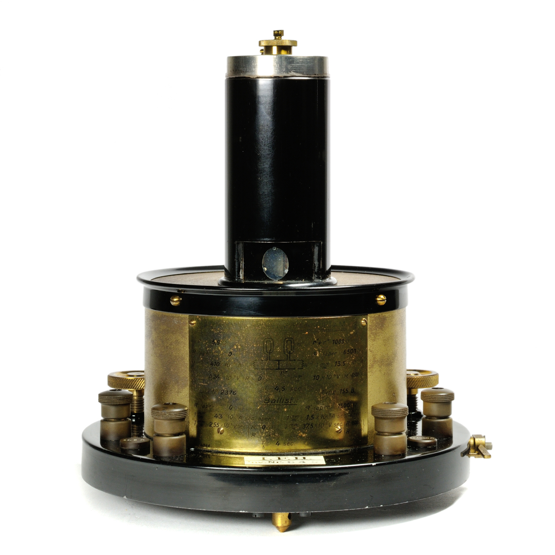 Messingschild auf dem Gehäuse (teilweise schwer lesbar): Seriennummer 2376 - Type 155 B Ballistisches-Galvanometer |