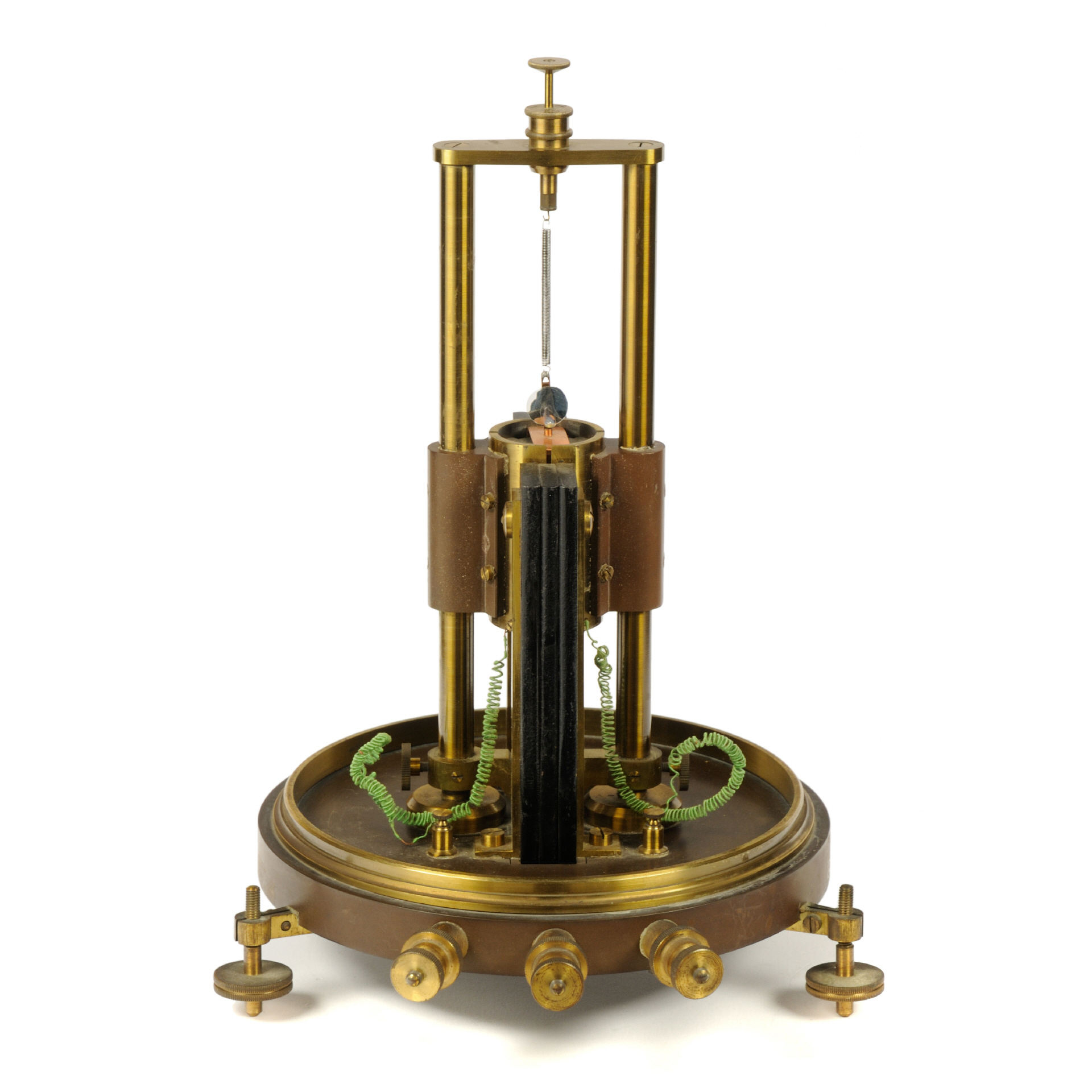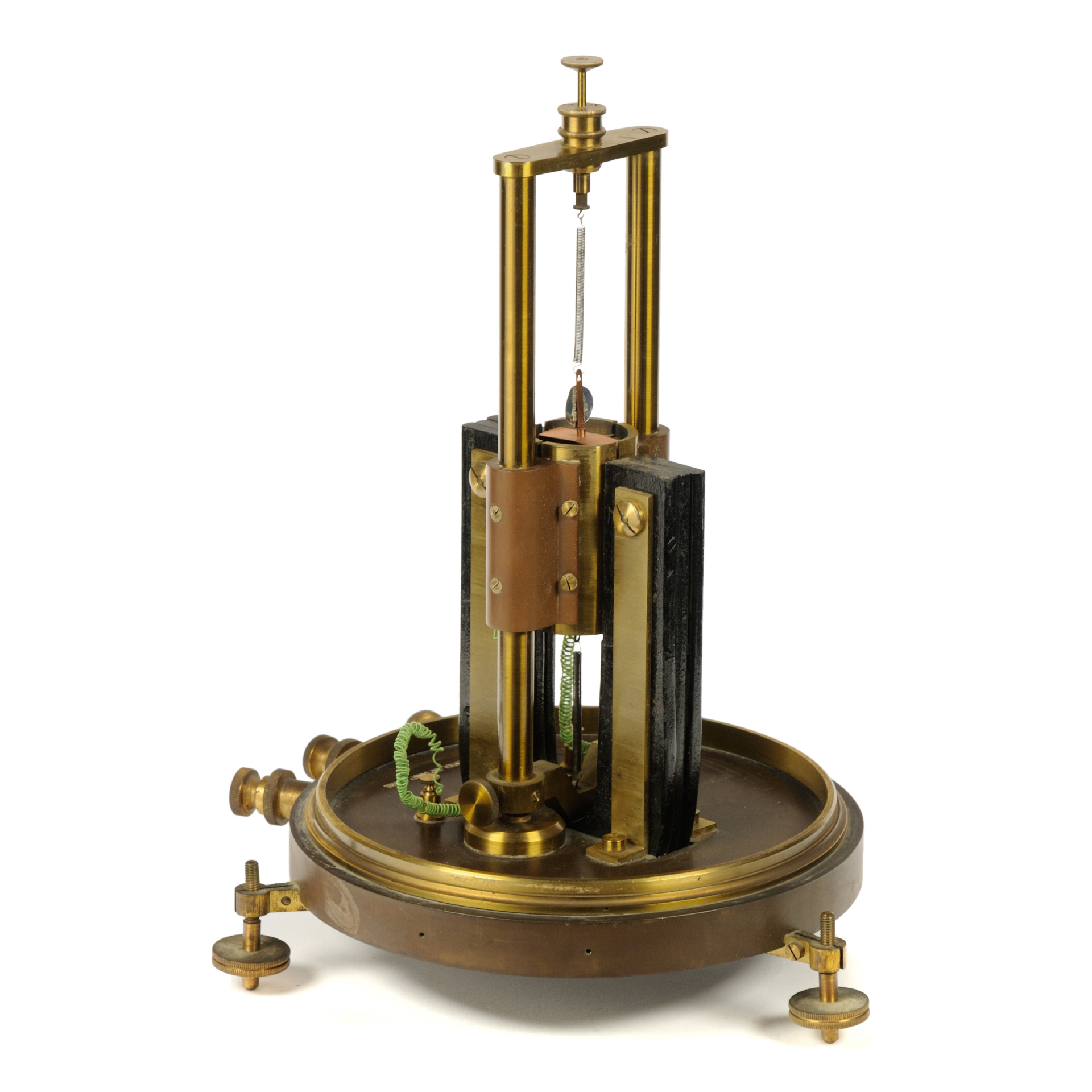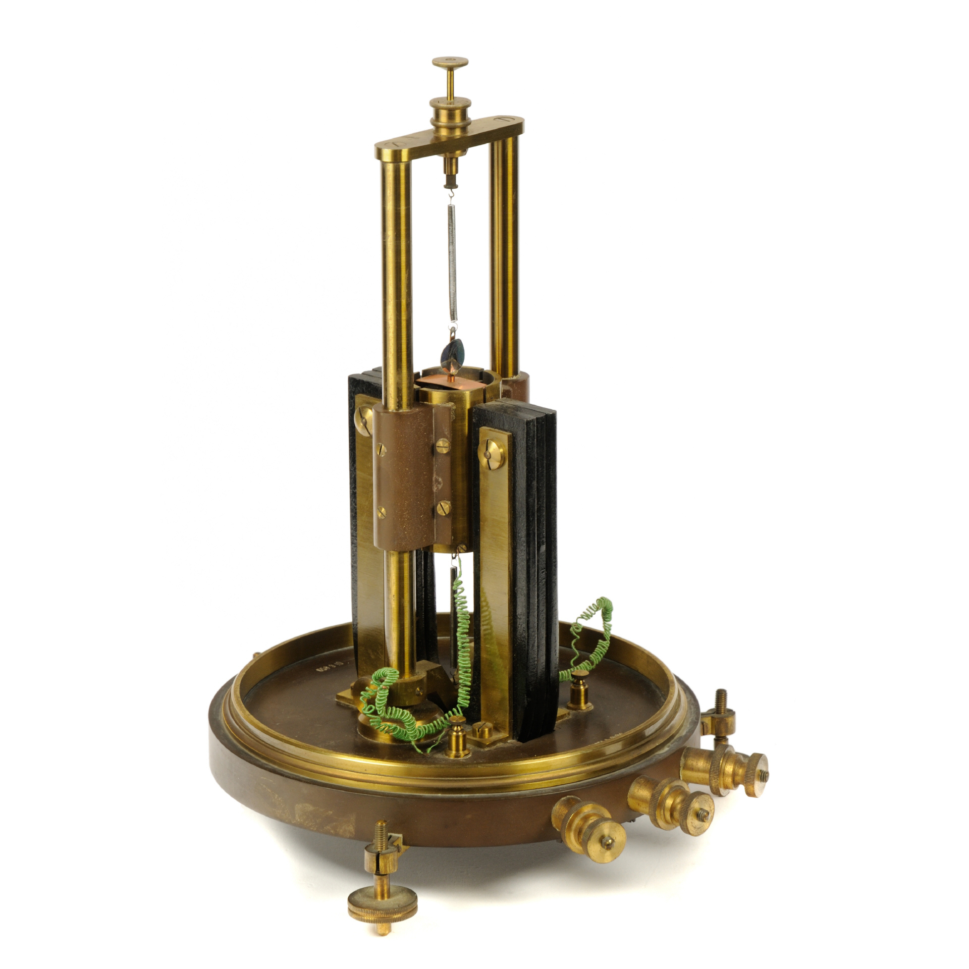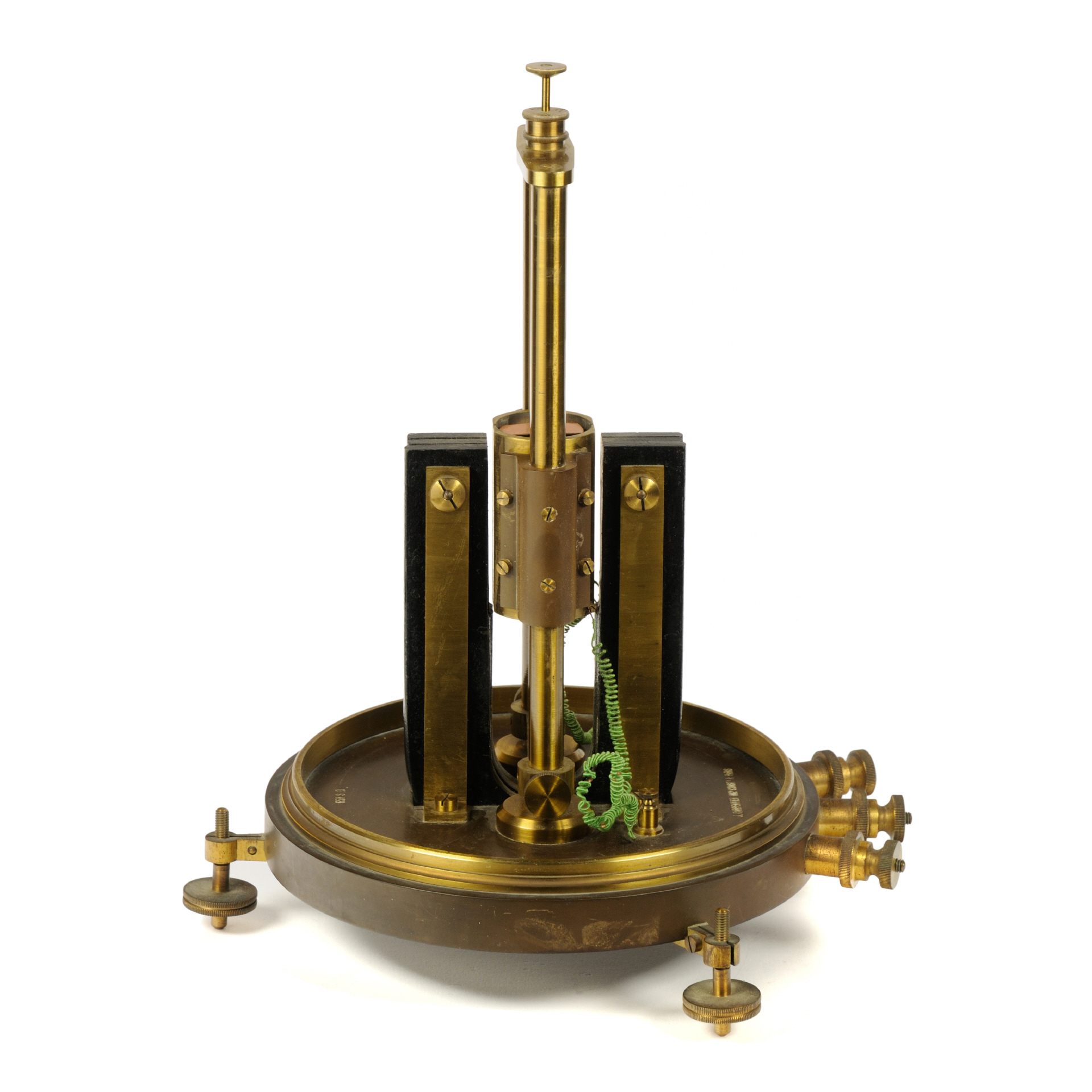 Vorab, Zweck und Funktionsweise dieses Geräts sind mir (noch) nicht bekannt. Das Gerät, hergestellt von J. Carpentier, wahrscheinlich im 4. Quartal des 19. Jahrhunderts, soll (unbestätigt!) von den Wissenschaftlern Grimaldi und Platania für Experimente rund um Polarisation und Depolarisation von dünnen Metallfolien, einschließlich Gold, Silber verwendet worden sein (das Gerät stammt aus Rom, Italien). Der Aufbau des Geräts erinnert an ein Spiegelgalvanometer bzw. ein Quadranten-Electrometer (nach Lord Kelvin), weist aber gravierende konstruktive Änderungen auf. Die Basis bildet eine dicke Ebonit-Platte mir drei nivellierbaren Standfüßen und drei Anschlussklemmen aus Messing. In der Mitte der Platte ist das Messwerk, befestigt auf zwei Messing-Säulen, welche einfach demontiert werden können (Rändelschrauben). Außerhalb des drehbar gelagerten Messwerks sitzt ein großer, kräftiger U-Magnet. Zwischen den Schenkeln dieses Magneten befindet sich ein feststehender "Kern", bestehend außen aus 4 Messingpolen (Quadranten), von denen zwei mit den äußeren Klemmen verbunden sind, die anderen beiden haben keine sichtbare Verbindung. Im Inneren befindet sich ein Eisenkern, der mittig durch eine Ebonitplatte geteilt ist (90° zur Achse des Magneten. Im Luftspalt zwischen diesem Eisenkern und den Messingpolen spielt eine "Spule", hier eine dünne Kupferfolie, die oben und unten über Torsionsfedern befestigt sind. An der Aufhängung dieser Folie befindet sich zudem ein kleiner Spiegel. Die Torsionsfeder kann über zwei Rändelschrauben (oben) vertikal ausgerichtet und verdreht werden. Die mittlere Anschlussklemme ist mit der zentralen Messing-Halterung verbunden (vermutlich der Masseanschluss). |