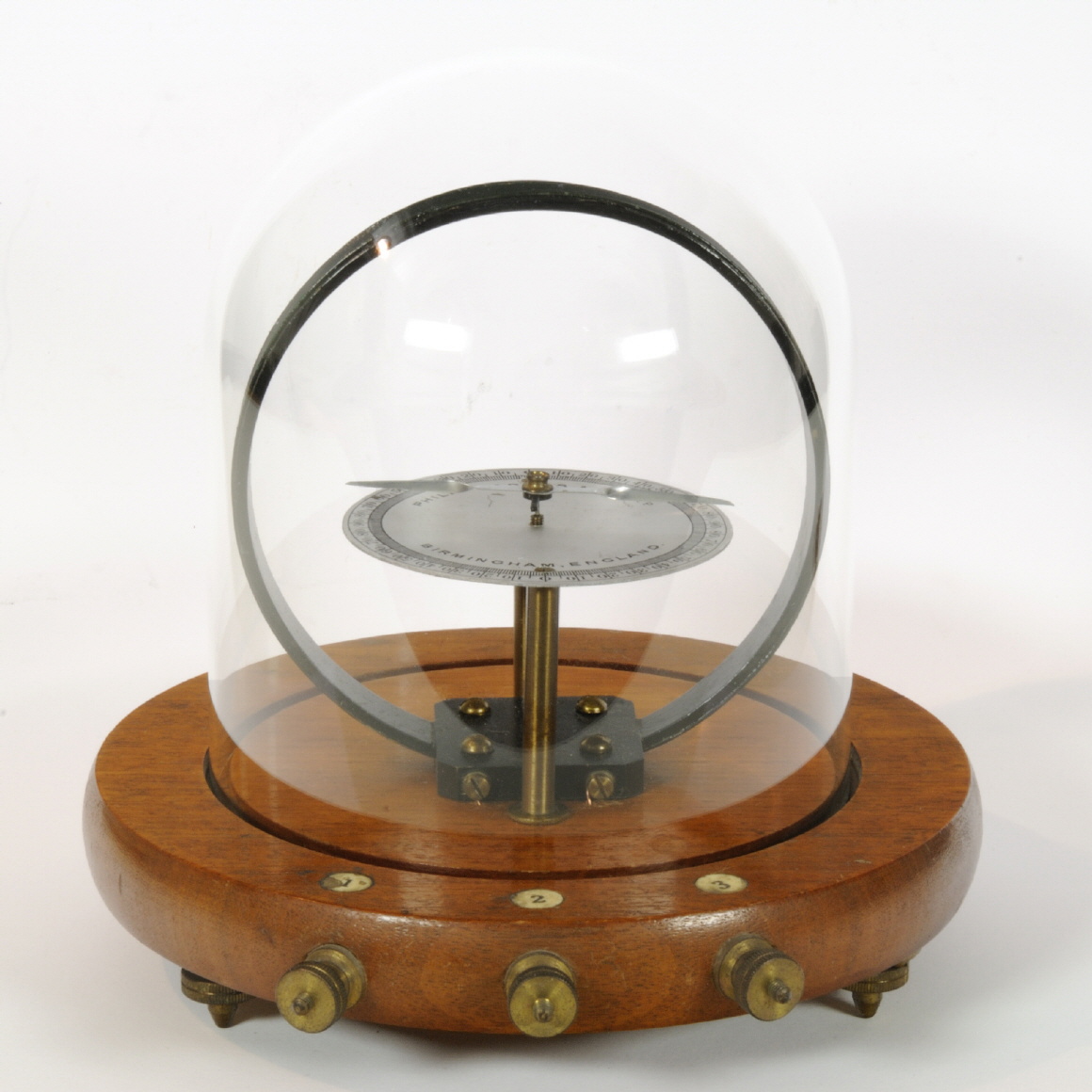 Originalzustand, keine fehlenden Teile, voll funktionsfähig. Das Galvanometer ist sehr einfach konstruiert. Die Skala ist auf zwei Abstandshaltern montiert, die Skala sitzt in einem Lager in der Mitte. Die Drahtspule ist auf einem einfachen Spulenträger gewickelt. Die gesamte Konstruktion ist auf einem polierten Mahagoni-Sockel montiert, der auf drei in der Höhe verstellbaren Füßen steht. Das Galvanometer ist durch eine Glashaube (auch diese hat das letzte Jahrhundert unbeschadet überstanden) geschützt. |