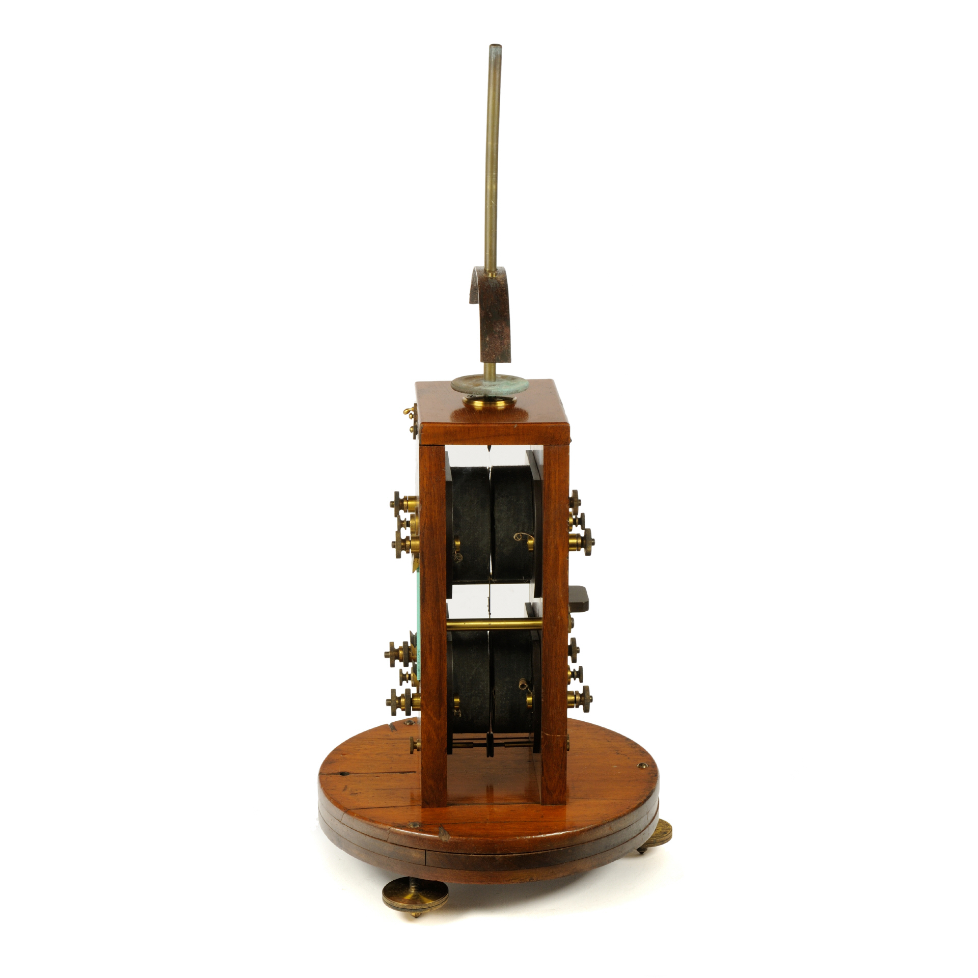 Das hier vorgestellte Instrument ist ein vierspuliges astatisches Galvanometer der Firma Keiser und Schmidt, konstruiert von H. du Bois und H. Rubens. Die Basis bildet eine Hartholzplatte (Mahagoni) auf drei Stellschrauben. Auf dieser Holzplate ist ein zweiteiliges Holzgehäuse, ebenfalls aus Mahagoni, montiert, dessen Vorderseite entfernbar ist. Auf einer in der Mitte des Deckels emporragenden kurzen Stift lässt sich eine längere vertikale Hülse schieben, auf der sich zwei Richtmagnete, ein größerer und ein kleinerer (dem Exponat fehlt einer der Magnete), drehbar hin und her bewegen lassen. Auf der Rückseite des Gehäuses befindet sich ein Verriegelungsbalken aus Messing. Durch drehen dieses Balkens wird die Verriegelung des Gehäuses gelöst und der gesamte Vorderteil (inklusive der daran befindlichen Spulen) kann gelöst werden. Das Messwerk, ein astatisches Thomsonsches Nadelsystem, ist dann zugänglich. Das Nadelsystem besteht oben und unten jeweils aus einem Magnetbündel, in der Mitte befindet sich der versilberte Planspiegel. Unten am System ist noch ein Flügel befestigt, welcher zur Dämpfung und Arretierung verwendet werden kann. Das Nadelsystem ist so konstruiert, dass es einfach entfernt werden kann. Die obere Halteschraube ist in einen horizontalen Messingbügel eingesteckt und kann durch mäßigen Druck herausgedrückt werden. Als Zubehör zu dem Gerät gab es auch noch ein Kästchen mit zusätzlichen Messwerken unterschiedlicher Empfindlichkeit. Jeweils auf der Innenseite der Front- und Rückwand sitzen die 4 Spulen, die von außen über Messingkontakte zugänglich sind. Die Seitenwände bestehen aus Glas, dadurch ist der Blick in das Innere des Geräts möglich. |