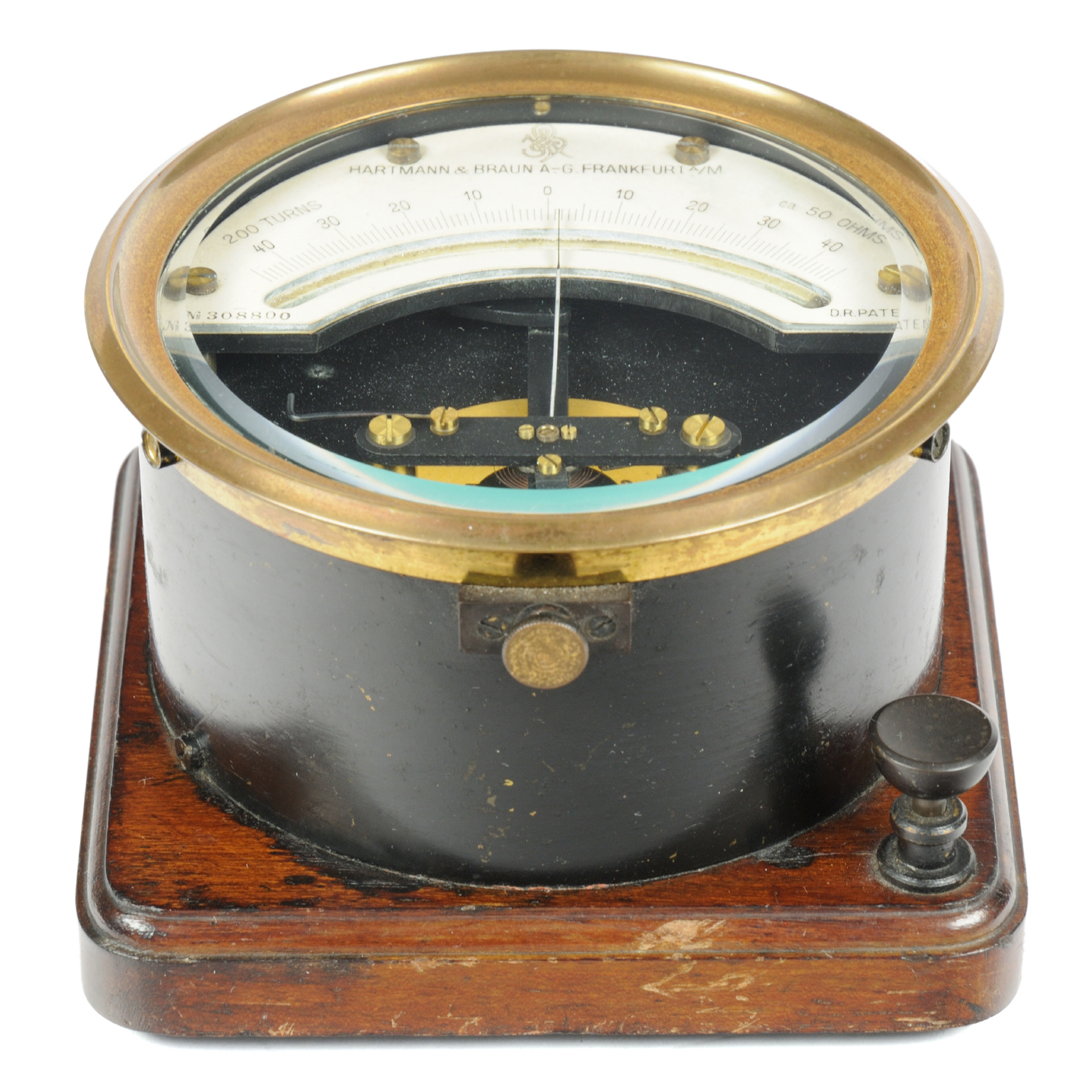 Skalenbeschriftung: "HARTMANN & BRAUN A.-G. FRANKFURT A/M" "200 TURNS" "ca. 50 OHMS" "No. 308800" "D.R.PATENT" |