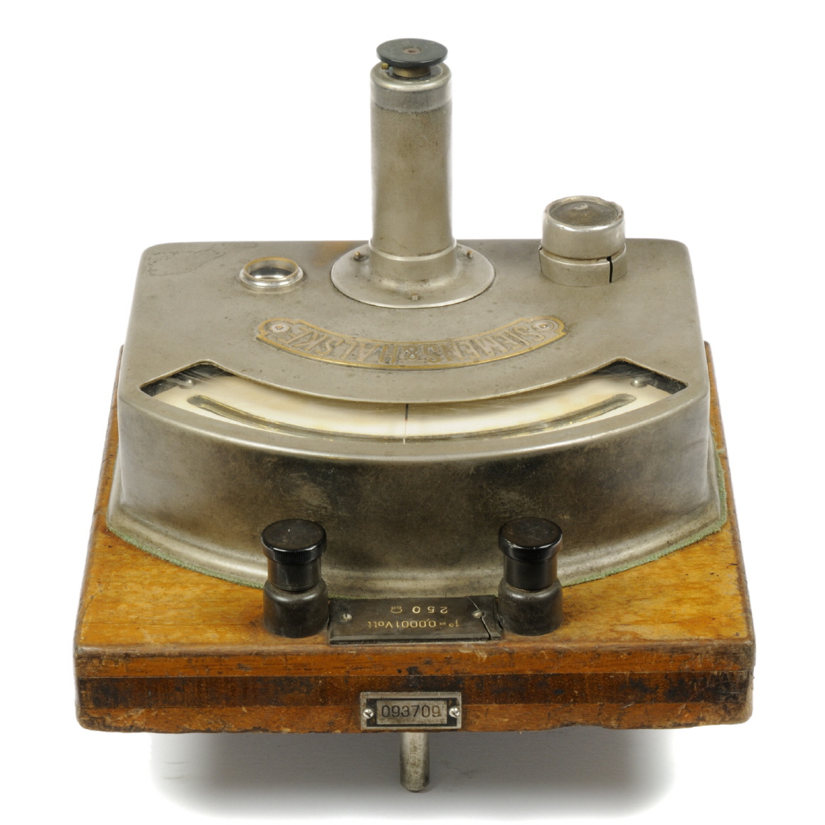 Das Exponat ist ein Zeigergalvanometer nach d'Arsonval, das mit einer Spannbandaufhängung ausgestattet ist. Die Skala mit linearer Einteilung von 50 ... 0 ... 50 ist als Spiegelskala ausgeführt. Das Gerät hat einen Holzsockel mit Nivellierfüßen, das Messwerk ist in einem Blechgehäuse untergebracht. |