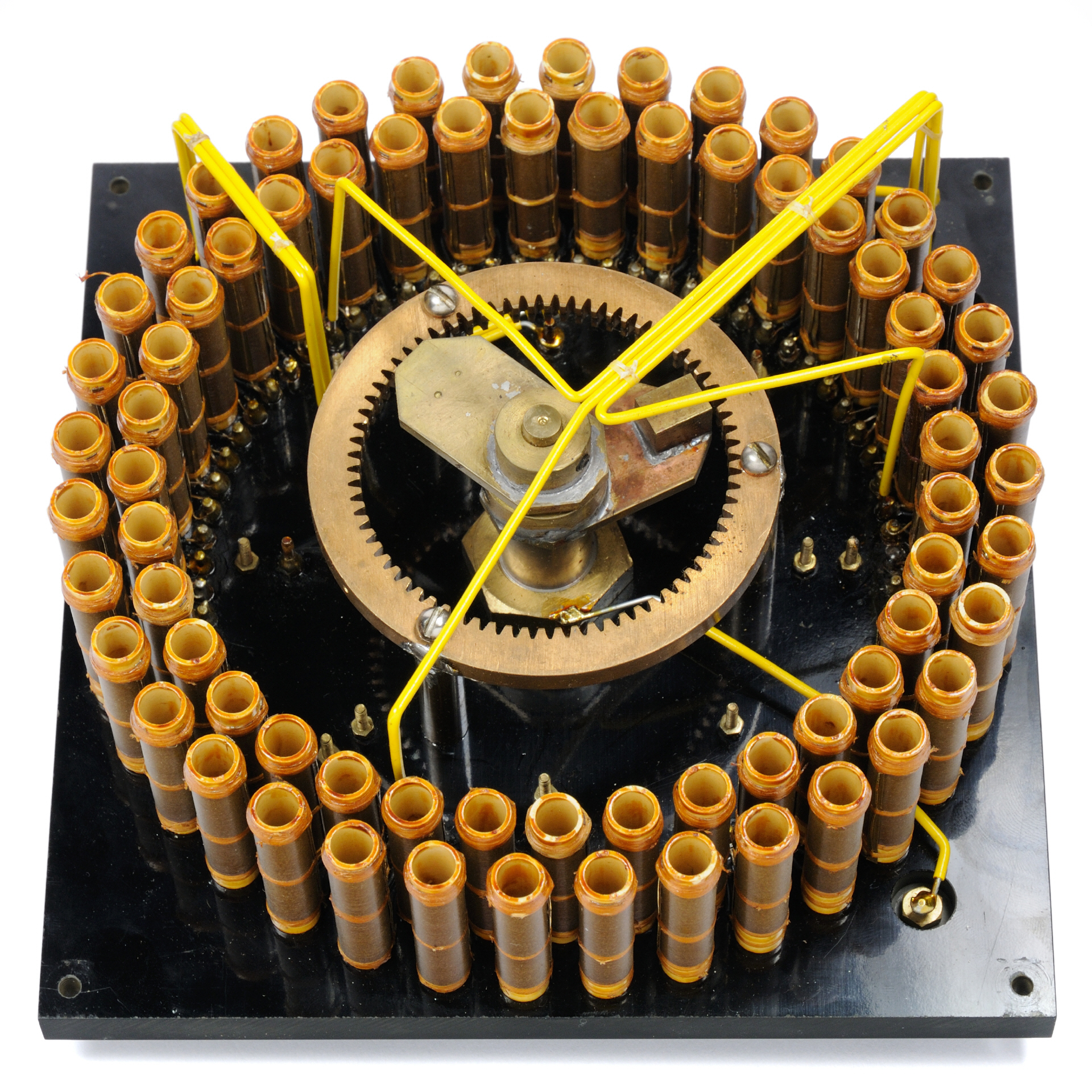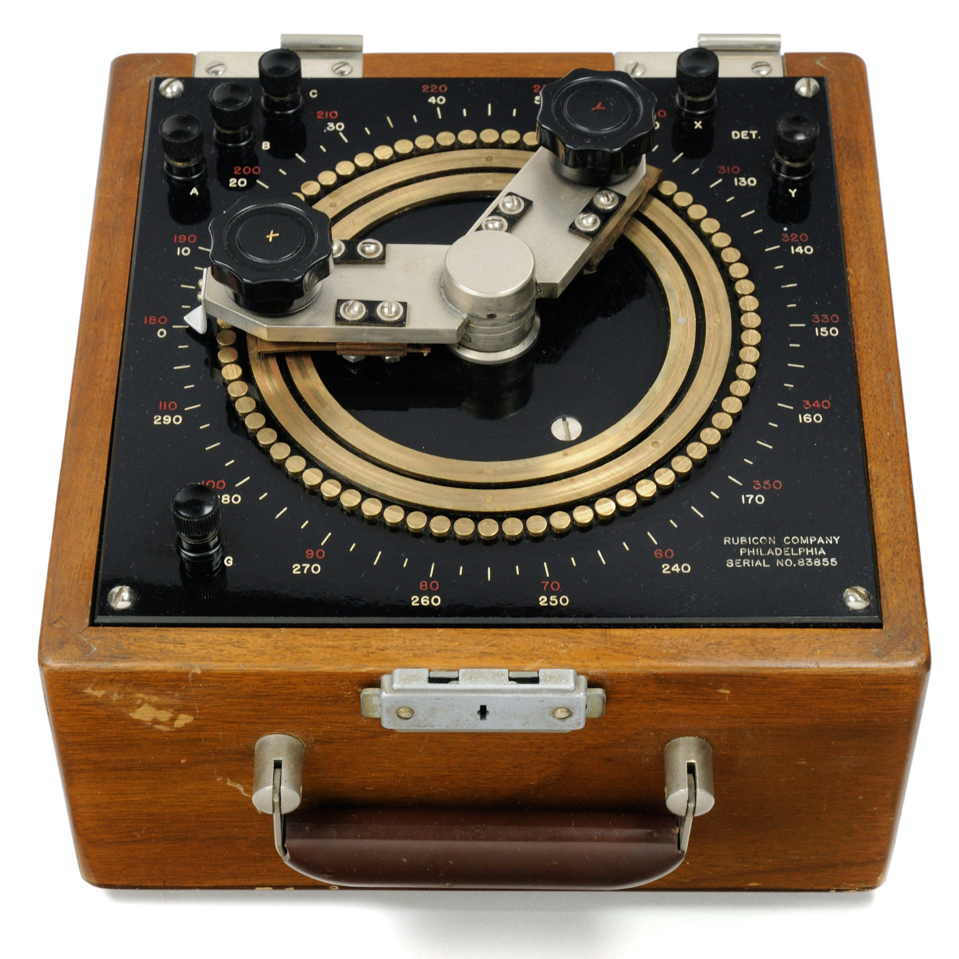 Die Verwendung des Apparats ist noch unbekannt. Das Gerät besteht aus 72 EInzelwiderständen, die in Serie geschaltet sind, wobei ein geschlossener Kreis aus allen Widerständen entsteht. Die drei linken Klemmen, bezeichnet mit "A", "B" und "C" unterteilen den Widerstandsring in drei 120° Bereiche, mit je 24 Widerständen. Der gemessene Widerstand zwischen "A-B", "B-C" und "A-C" beträgt jeweils 6,66 kΩ, daraus ergibt sich ein Widerstandswert von ca. 10 kΩ pro Teilbereich bzw. 416,667 Ω pro Widerstand. Die Abgriffe auf der Oberseite sind in zwei Kreisen beschriftet, der weiß beschriftete ist der Klemme "X" zugeordnet und, beginnen bei der 9 Uhr Position, mit den Werten 0 ... 50, 120 ... 170 und 240 ... 290 beschriftet, der rot beschriftete ist der Klemme "Y" zugeordnet und mit den Werten 180 ... 230, 300 ... 350 und 60 ... 110 beschriftet. Die beiden Schleifkontakte, ebenfalls mit "X" und "Y" beschriftet übersteichen jeweils 360° der Skala, wobei die Schleifkontakte zueinander nur in einem Bereich von 120° beweglich sind. Der Schleifkontakt "X" wird über den äußeren der beiden Schleifringe abgegriffen und der Klemme "X" zugeführt, der Schleifkontakt "Y" nutzt entsprechend den inneren Ring und die Klemme "Y". Die Klemme "G" ist mit der Achse des Schleifkontakts verbunden und dient zur Erdnung ("G" - "Ground"). Die Klemmen "A", "B" und "C" stehen damit immer in einem direkten Zusammenhang mit den Klemmen "X" und "Y". |