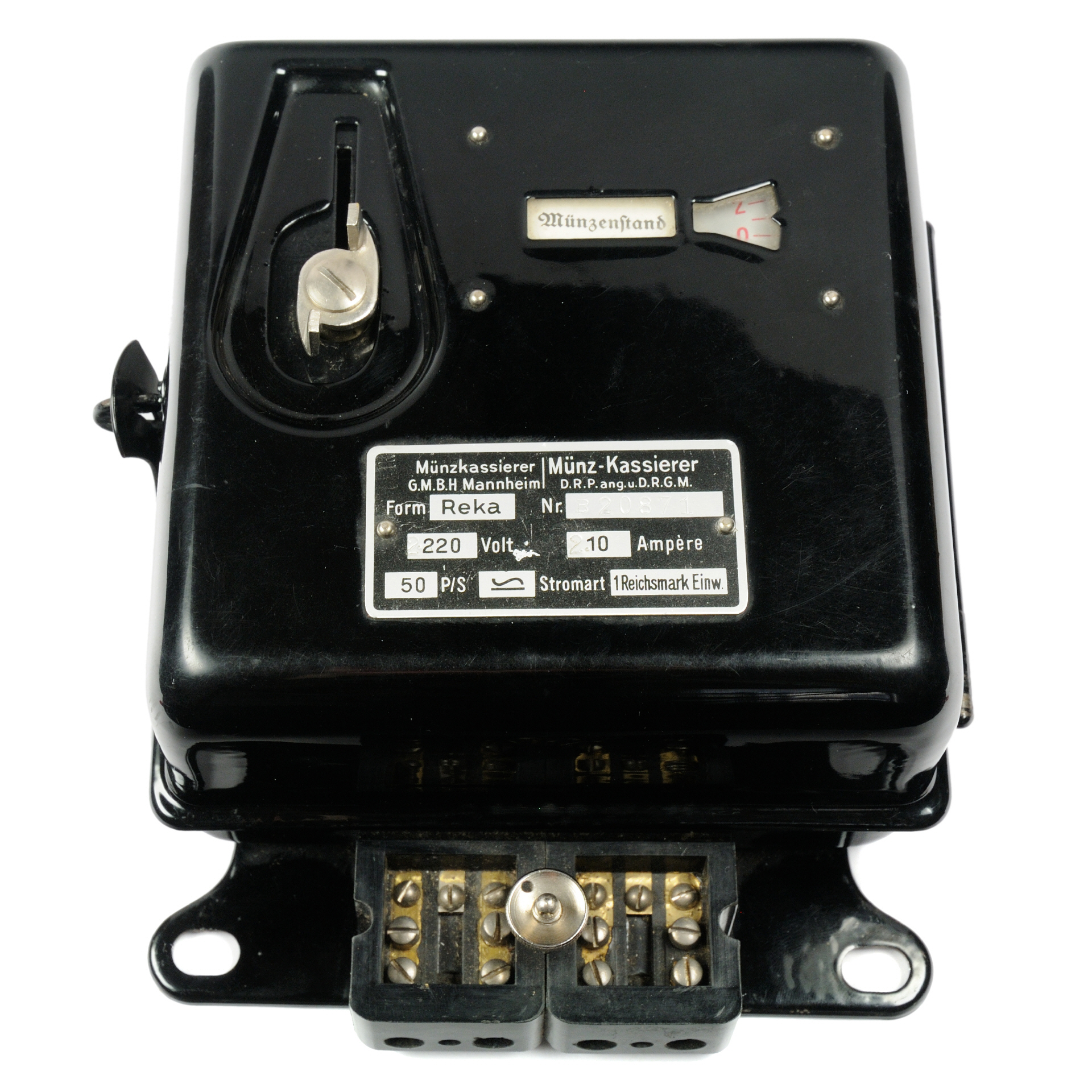 Der Münzkassiererhat eine eingebautes, einfaches Uhrwerk, das durch den Münzeinwurf aufgezogen wird. Über zwei eingebaute Quecksilberschalter wird der Stromfluß durchgeschaltet, solange das Uhrwerk läuft. |