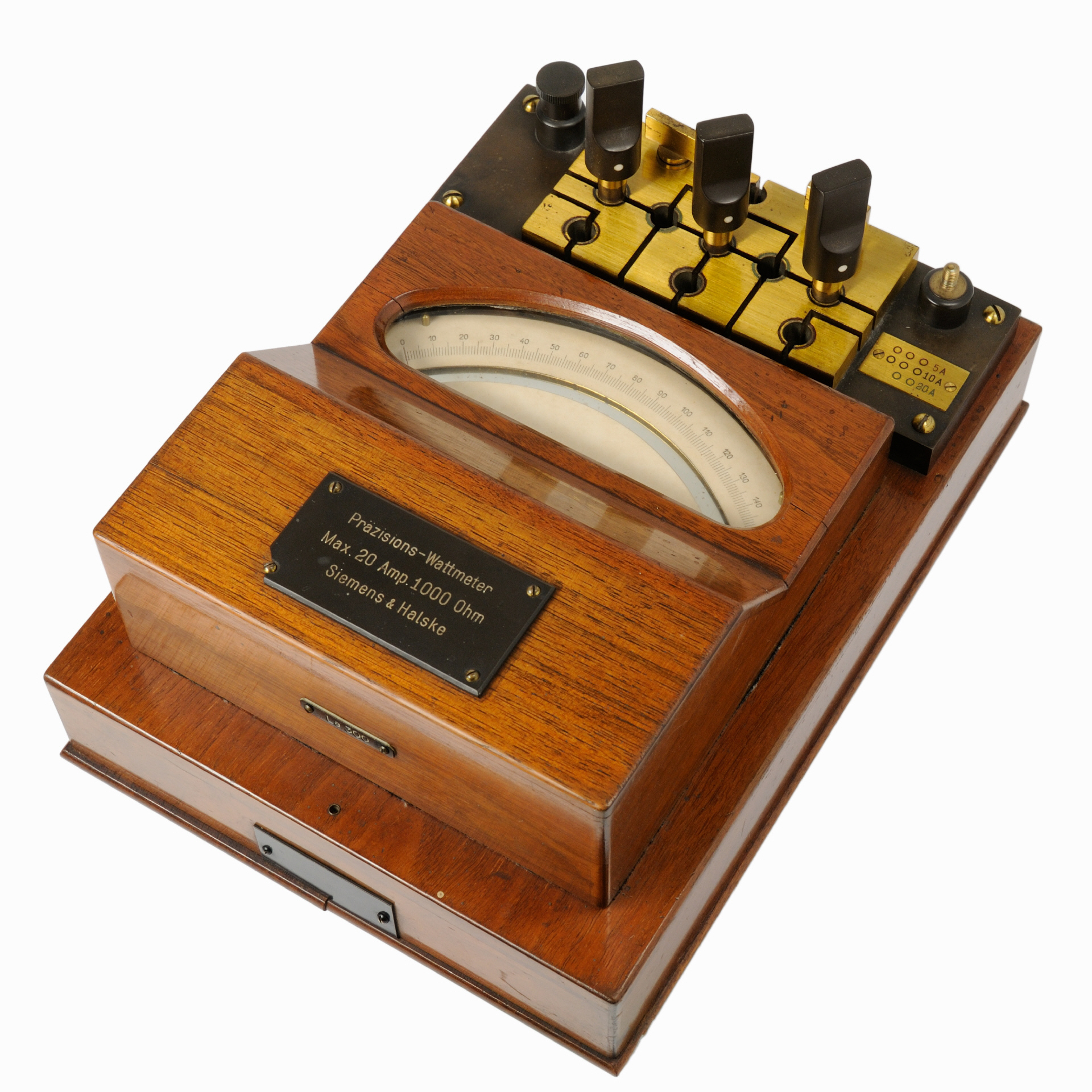 Seriennummer auf der Stirnseite "1385935", geschraubt. Auf der Oberseite ist eine Plakette mit der Aufschrift "Präzisions-Wattmeter / Max 20 Amp / SIEMENS & HALSKE". |