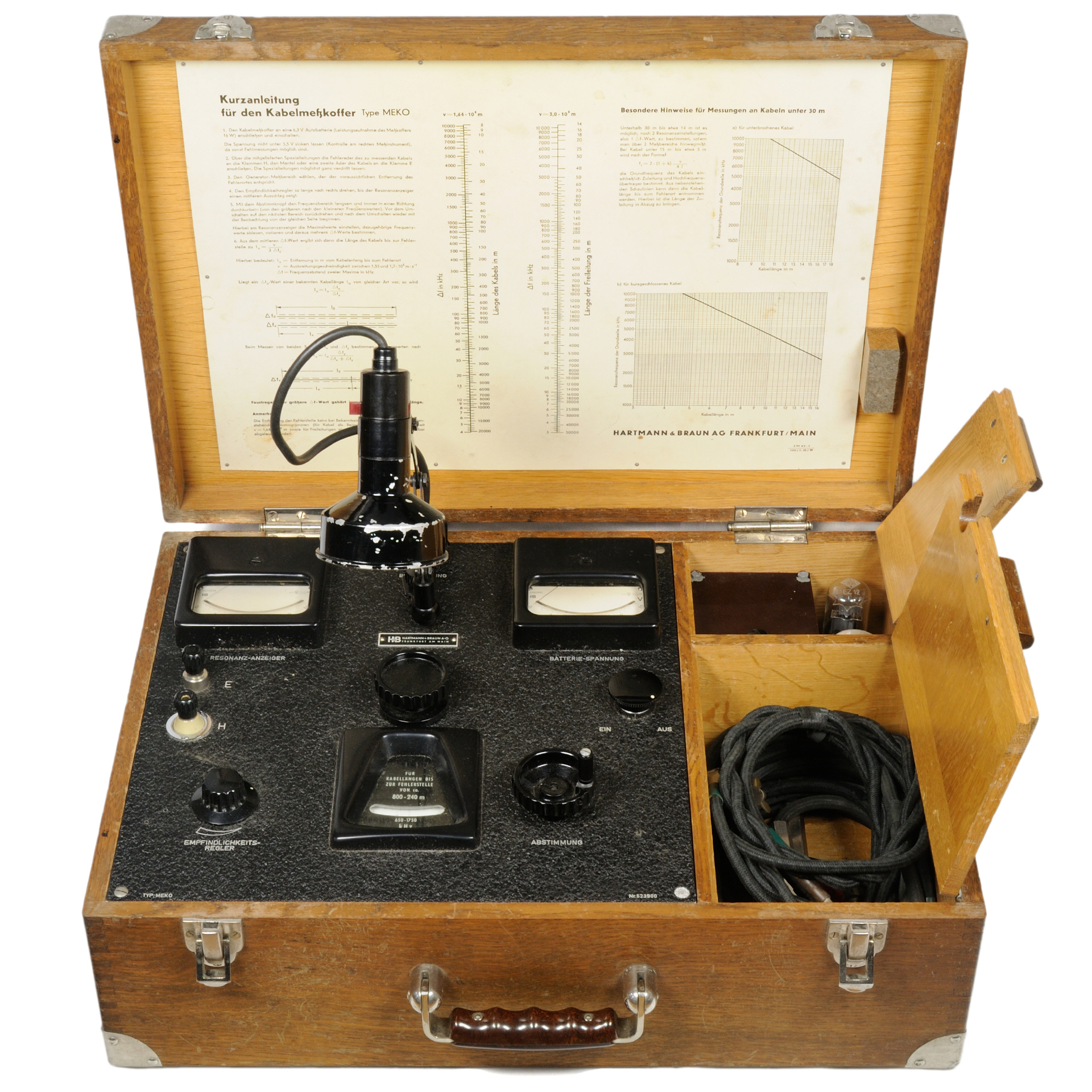 Der Kabelmesskoffer enthält außer dem Hochfrequenzerzeuger alle erforderlichen Schalt-, Einstell- und Messorgane. Auf der Schaltplatte sind der Resonanzanzeiger (Zeiger- Mikroamperemeter), das Voltmeter zur Kontrolle der Batteriespannung, der Wähler für 7 Frequenzbereiche zwischen 34 kHz und 10000 kHz, der Abstimmknopf und der Empfindlichkeitseinsteller angeordnet. Mit dem Frequenzbereich bis 10000 kHz können Kabel bis herunter zu einer Länge von 2 m eingemessen werden.
