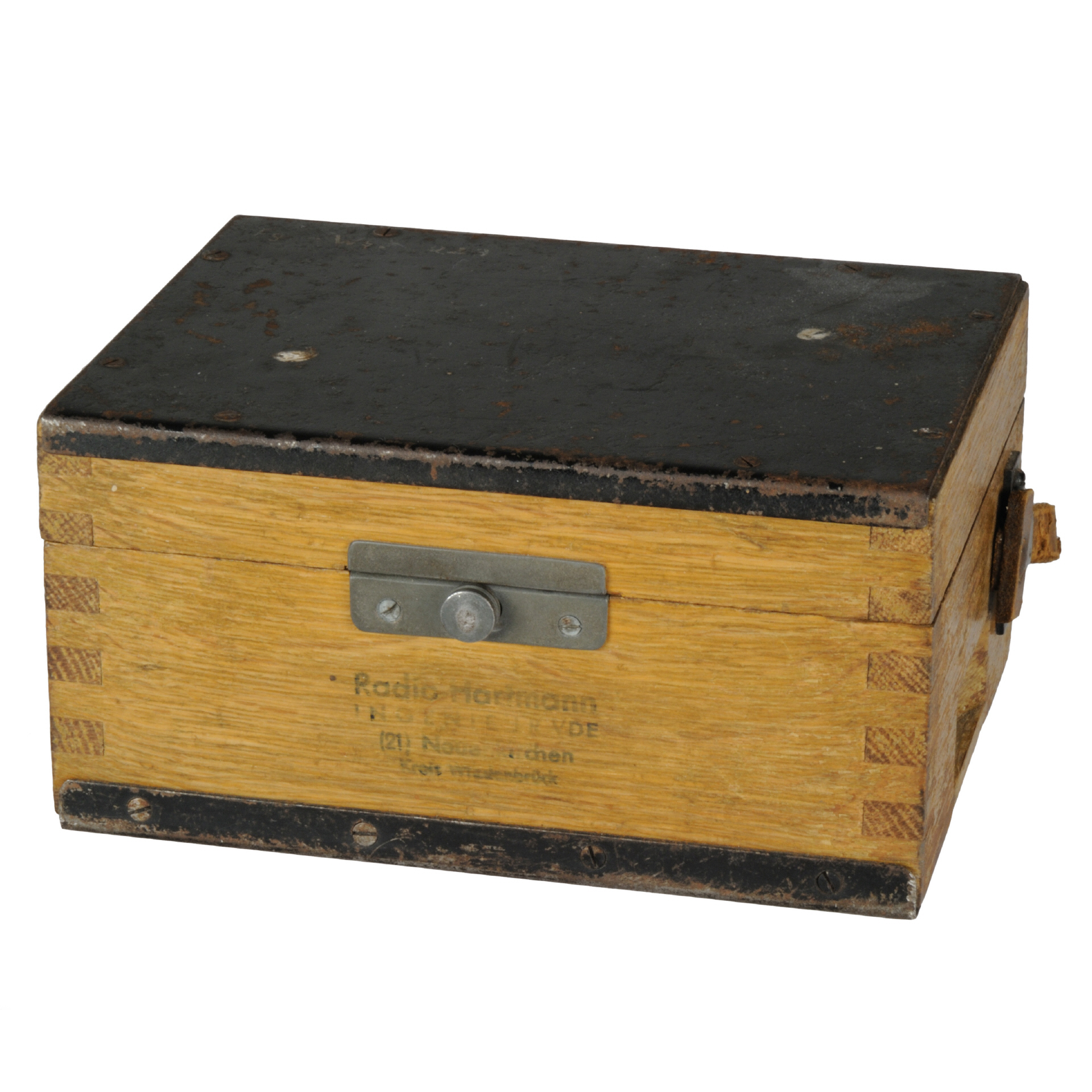 | Material | Holzgehäuse mit Blechbeschlag (Panzerholz), Tragriemen aus Leder |