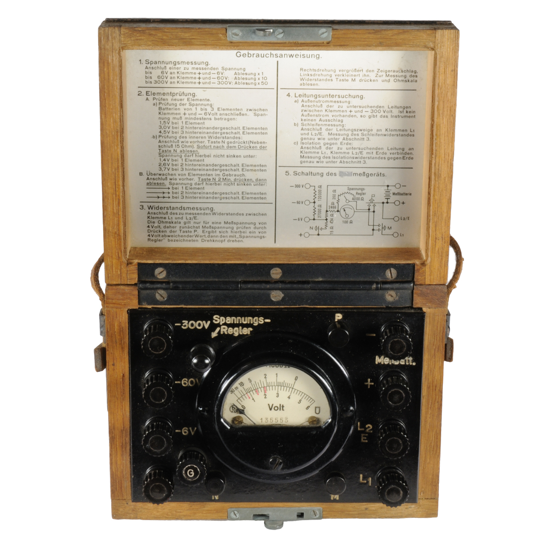 ![[00010] kleines Feldmeßgerät zur Spannungs, Element- und Leitungsprüfung, Widerstandsmessung, Holzgehäuse mit Blechbeschlag; Gebr. Ruhstrat AG; ca. 1940](../../images/00010_d_ruhstrat_feldmessgeraet_box2table25.jpg)