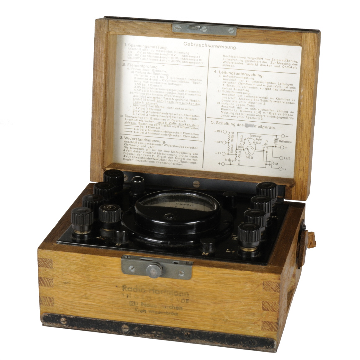 ![[00010] kleines Feldmeßgerät zur Spannungs, Element- und Leitungsprüfung, Widerstandsmessung, Holzgehäuse mit Blechbeschlag; Gebr. Ruhstrat AG; ca. 1940](../../images/00010_d_ruhstrat_feldmessgeraet_offentable25.jpg)