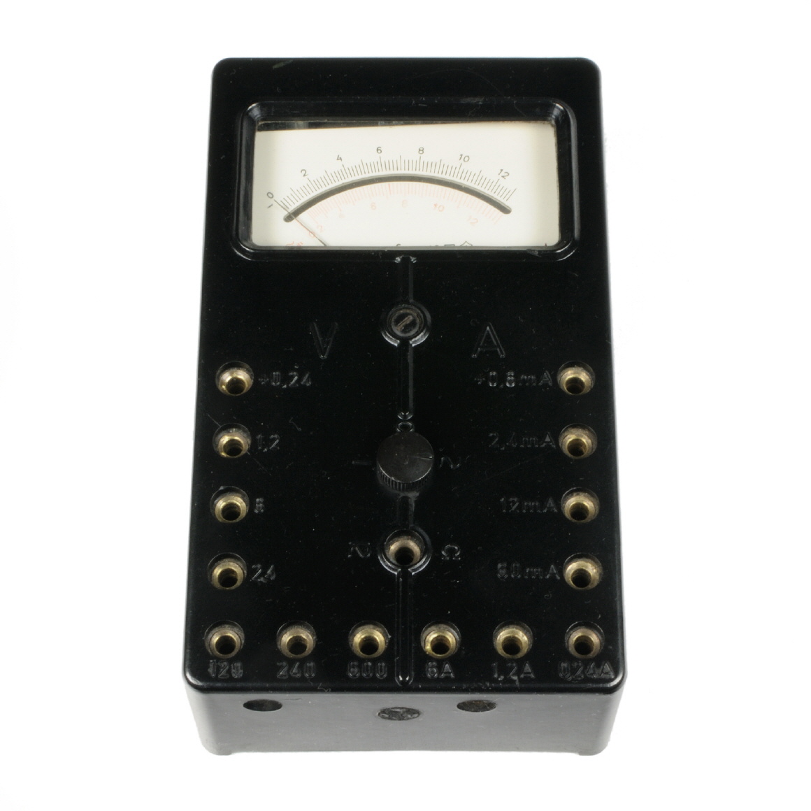 Das Gerät besitzt einen kleinen Drehschalter in der Mitte, mit dem zwischen Gleich- und Wechselspannung, sowie Widerstandsmessung umgeschaltet werden kann. Die Auswahl des Messbereichs erfolgt über verschiedene Kontakte.