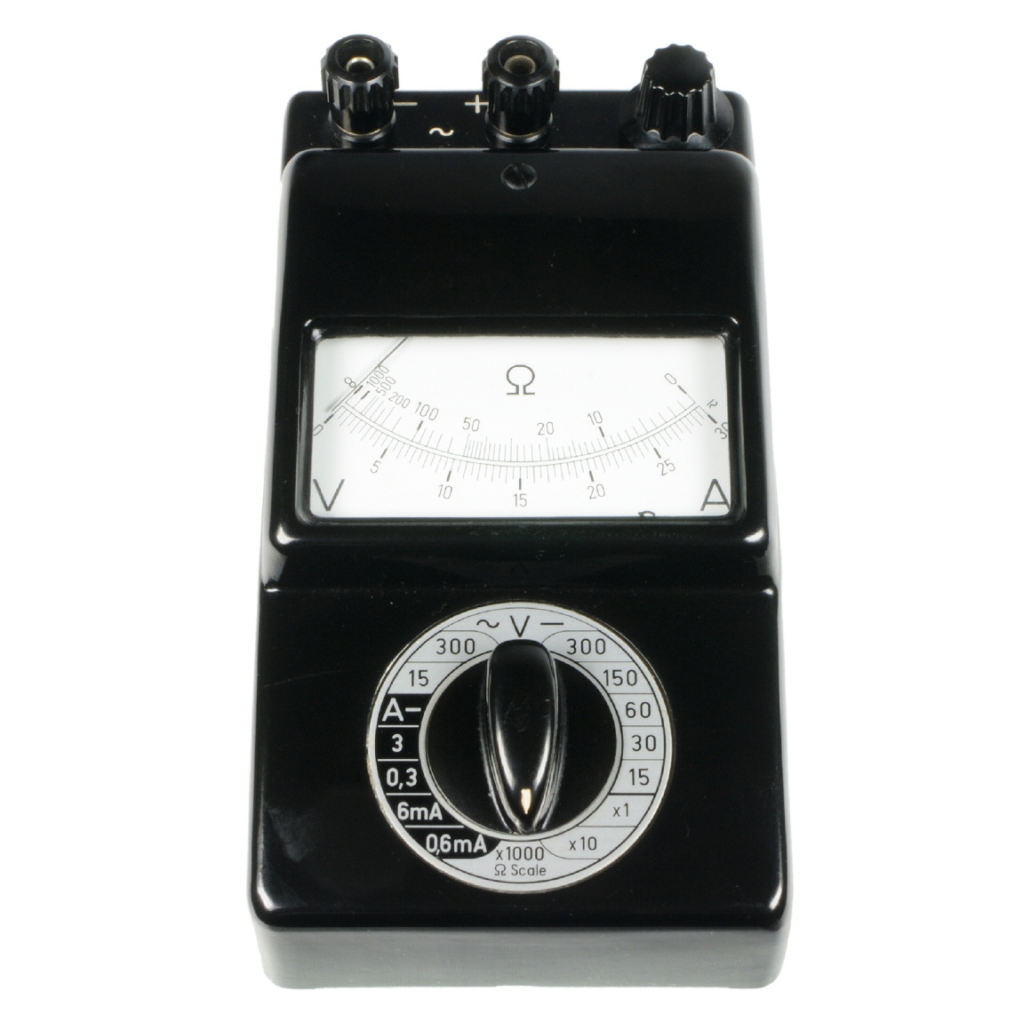 Der 0-Abgleich bei der Widerstandsmessung muss jeweils nach Umschalten des Messbereichs erfolgen, dazu werden die beiden Klemmen kurzgeschlossen und mit dem Potentiometer wird dann der Zeigerausschlag auf 0 eingestellt.