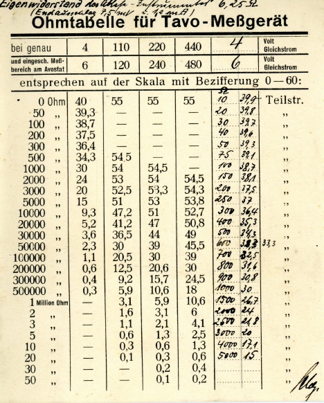 Das Gerät wurde 1930 geliefert, ein Schreiben des Herstellers bzgl. der Ohmtabelle mit Datum vom 30.07.1930 liegt dem Exponat bei. Das Gerät wurde 1962 in Nürnberg repariert, der Rücksende-Abschnitt des Reparaturauftrags mit Datum vom 24.01.1962 liegt dem Exponat bei.