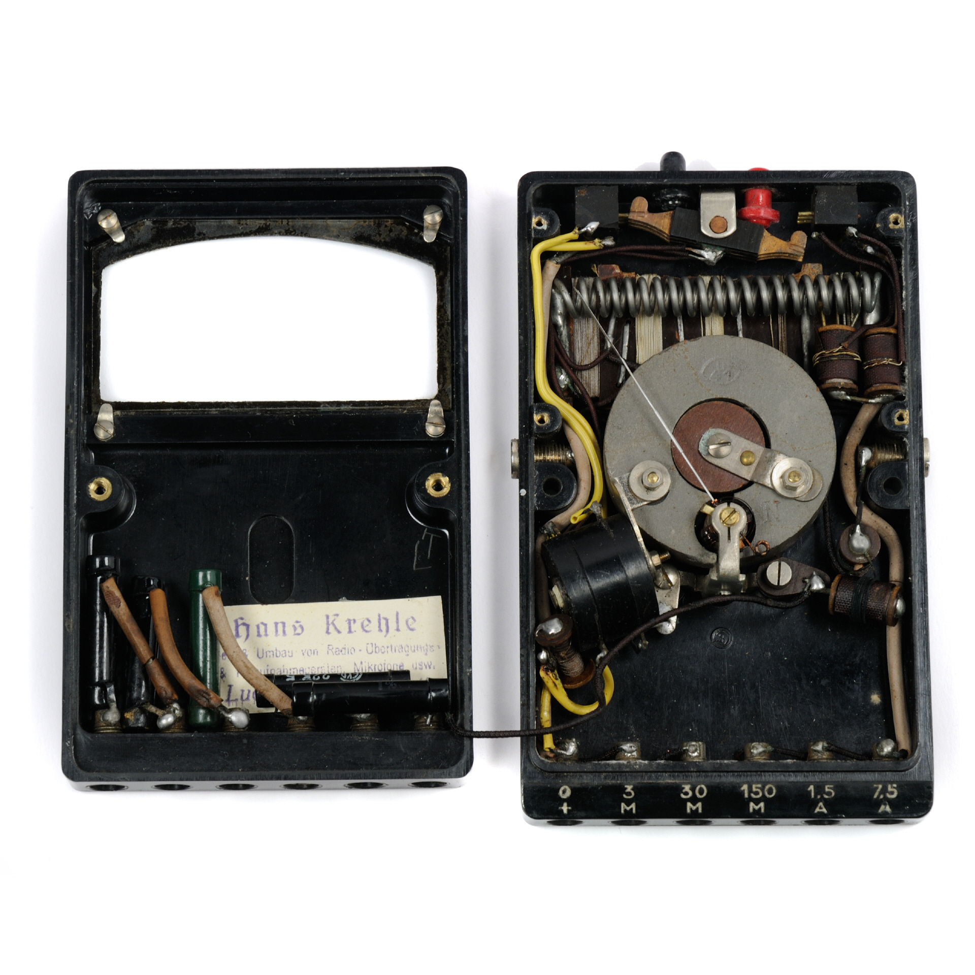 Hersteller- und Typenbezeichnung auf der Skala; Skalennummer 100932 SC; Auf der Innenseite des Deckels findet sich noch ein eingeklebter Zettel der Firma Hans Krehle, Ludwigsburg/Württ. (Umbau oder Reparatur des Geräts) |