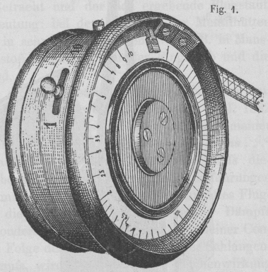 Um den Apparat so handlich wie möglich zu machen, wurde ein Telephon gewählt, welches möglichst geringe Abmessungen besitzt. Dasselbe ist von Hartmann und Braun in Frankfurt-Bockenheim construirt und enthält einen aufgeschnittenen stählernen Flachring, welcher als Magnet dient. Die beiden Polschuhe mit den Inductionsspulen sind nach der Mitte des Ringes verlängert; das ganze Telephon hat, wie aus Fig. 1 zu ersehen ist, die Form einer flachen, runden Apothekerschachtel und diese Form ist durch das Hinzufügen eines Meßdrahtes nebst Schleifcontactes und zweier Vergleichswiderstände nicht wesentlich geändert worden.