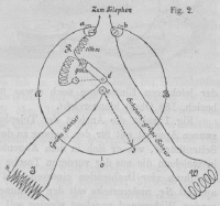 Fig. 2 zeigt nach dem Centralblatte für Elektrotechnik, 1886 * S. 160 das Schema des Apparates: aAOsBb ist der Meßdraht der nach Kirchhoff abgeänderten Wheatstone'schen Drahtcombination, R der aus zwei Theilen bestehende bifilare Vergleichswiderstand von 9 bezieh. 1 Ohm, welcher entweder je nach der Stellung des Umschalters df vollständig, oder nur mit dem kleineren Theile zu 1 Ohm eingeschaltet wird. An b und d wird der zu messende Widerstand W angelegt; es bedeutet den Schleifcontact, c und d stehen mit der secundären Spule eines kleinen Stöhrer'schen Inductionsapparates in Verbindung, welcher unmittelbar auf einem Trockenelemente angebracht ist. Die letzten beiden Apparate sind in einem zum Umhängen mit Schulterriemen versehenen Ledergehäuse geborgen; ein besonderes Gefach desselben dient zur Aufbewahrung des Telephons mit Drahtbrücke. Von den vier vom Telephon ausgehenden, zu einem kurzen Kabel vereinigten Drähten sind die zwei für den Inductor I bestimmten mit grüner Umklöppelung versehen, während die beiden anderen für den zu messenden Widerstand W schwarzgrün umklöppelt und an den Enden mit Klemmschrauben versehen sind. Die Skala ist an der der Telephonöffnung gegenüber stehenden, um etwa 330° drehbaren Deckscheibe angebracht (vgl. Fig. 1); an dieser ist auch der Schleifcontact befestigt, welcher jedoch nebst dem kalibrirten Meßdraht zum besseren Schütze im Inneren gelegen ist. Der Zeiger für die Skala befindet sich am Gehäuse, die Ablesung geschieht unmittelbar in Ohm. Die Messungen umfassen bei den Apparaten für den gebräuchlichsten; Zweck (Blitzableiter): die Widerstände von 0,1 bis 100 Ohm, während die Bewegung des Schleifcontactes zum Zwecke der leichteren Einstellung noch etwas über diese Grenzen (bis 0,06 bezieh. 150 Ohm) hinausreicht.