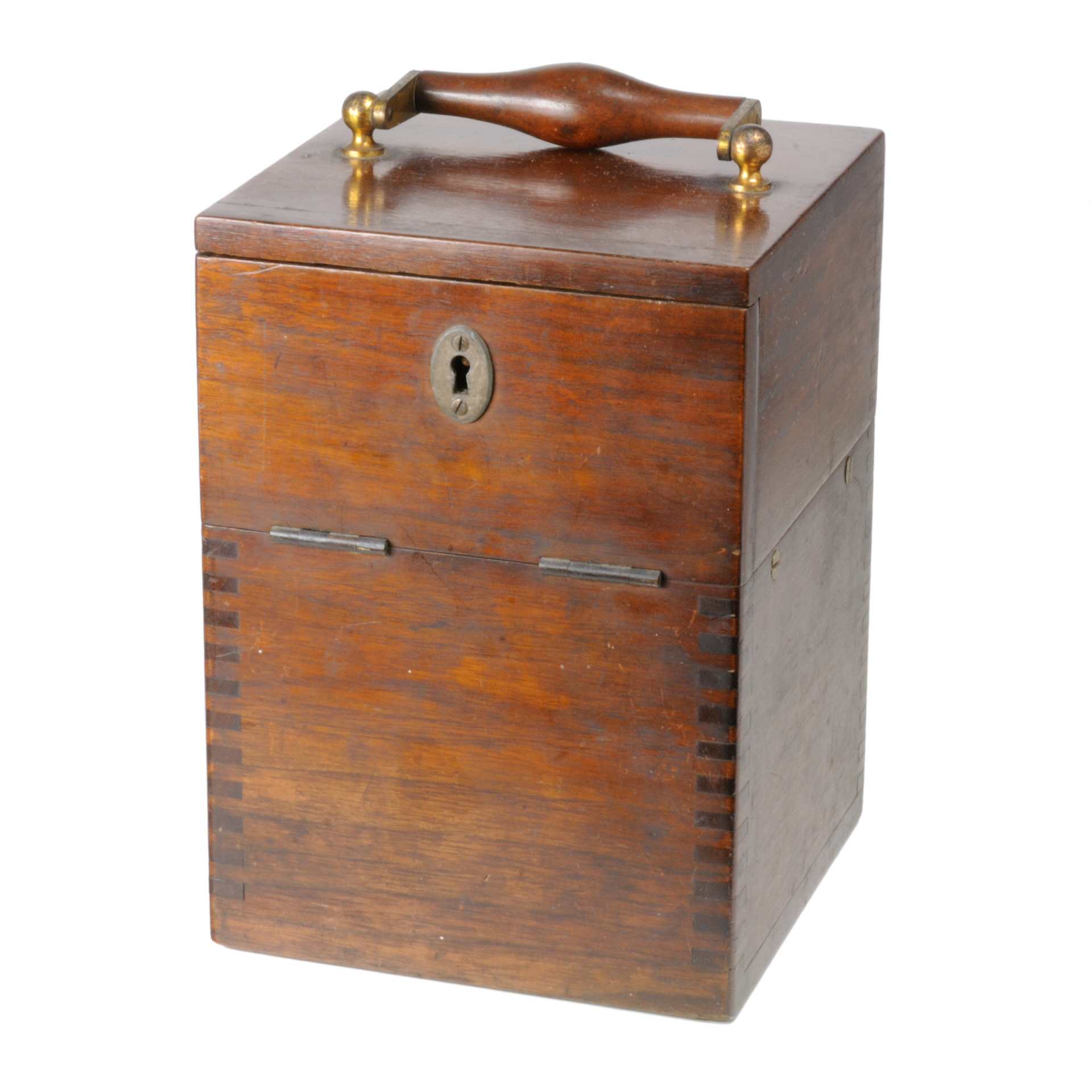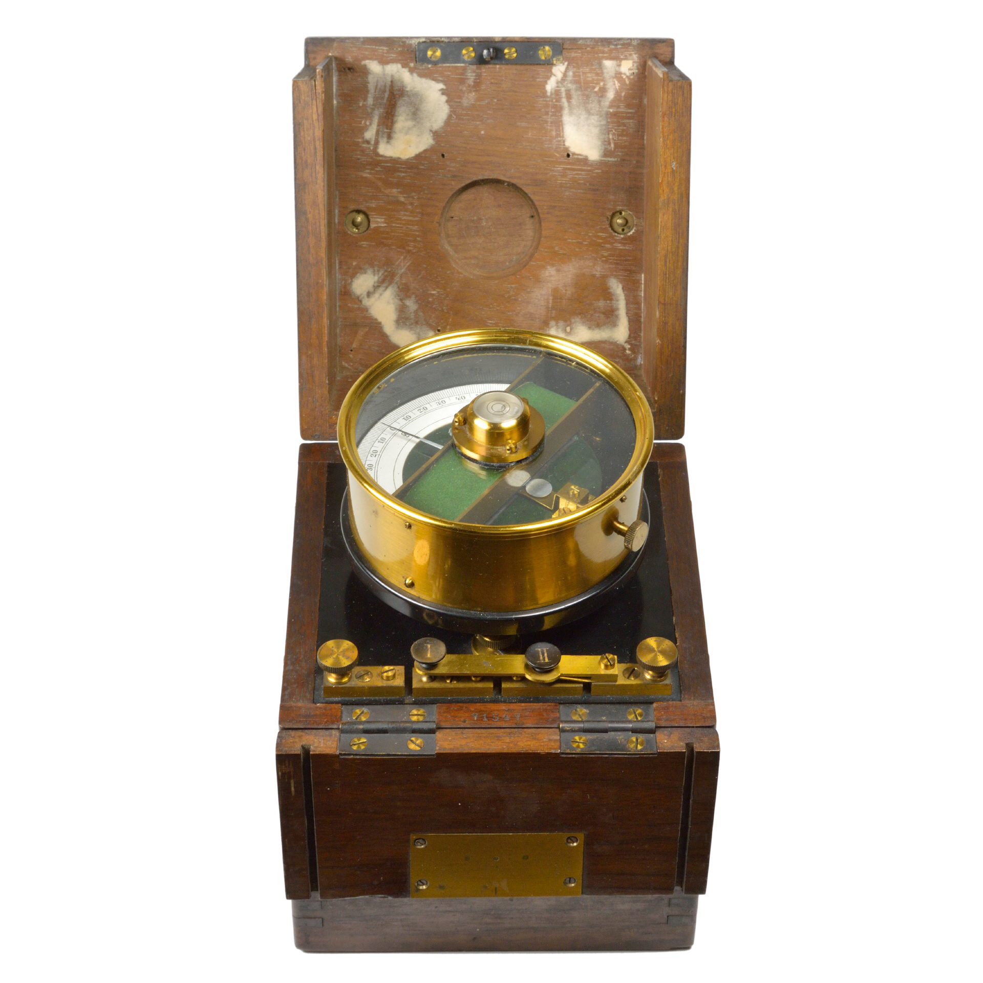 Das Gerät besteht im Wesentlichen aus drei Baugruppen. Das Gehäuse, aus verzapftem Mahagoni, lässt sich im oberen Teil öffnen (Deckel klappt nach hinten, Frontwand klappt nach vorne. Das Gehäuse ist mit einem einfachen Bartschlüssel gesichert, der Tragegriff aus Messing und Mahagoni ist auf dem klappbaren Deckel befestigt. Im Inneren finden die Trockenbatterien platz (diese sind jedoch nicht mehr vorhanden). Eine Basisplatte aus Ebonit bildet den Abschluss des Batteriefachs und gleichzeitig den Sockel für das Messwerk. Auf der Platte sind die Anschlussklemmen, die beiden Taster I und II sowie ein Widerstand und zwei Nivellierfüße. Das Messwerk sitzt in der nicht zentrischen Bohrung. Auf der Unterseite wird das Gerät durch eine Hülse und einer Feder gehalten, dies gewährleistet die drehbare Befestigung des Messwerks (um 360°). Die beiden Nivellierfüße (hinten, neben dem Widerstand) bilden gleichzeitig einen Anschlusspol für das Messwerk (äußerer Schleifring), der Zapfen vorne bildet den 2. Anschlusspol (innerer Schleifring). Das Nadelgalvanometer sitzt in einem runden Messing-Gehäuse (Ø ca. 110 mm), dessen Unterseite (Ebonit) mit zwei Schleifringen ausgestattet ist. Oben mittig sitzt eine Libelle zur Unterstützung der waagerechten Ausrichtung des Geräts. Die Nadel selbst besitzt eine Fixiereinrichtung. Die Skala besitzt eine lineare Einteilung von 70 ... 0 ... 70. Die Umrechnungstabelle zu den Widerstandswerten war ursprünglich auf der Innenseite des Deckels angebracht, diese fehlt hier. |