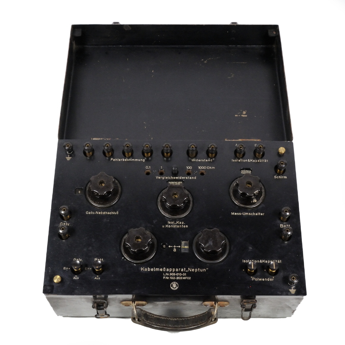 Der Kabelmeßapparat „Neptun" dient zur Ausführung von Isolations-, Kapazitäts- und Widerstandsmessungen sowie Fehlerortsbestimmungen mit Gleichstrom. Die Widerstands- und Fehlerortsmessungen werden dabei nach einer Brücken-Nullmethode, die Isolations- und Kapazitätsmessungen nach einer Vergleichsmethode ausgeführt. Durch seine handliche Größe, robusten Aufbau und einfache Bedienung eignet sich das Gerät nicht nur zur Messung im Labor und Prüffeld, sondern vornehmlich auch zur Verwendung bei Montage und Überwachung von Kabeln und elektrischen Leitungen.
