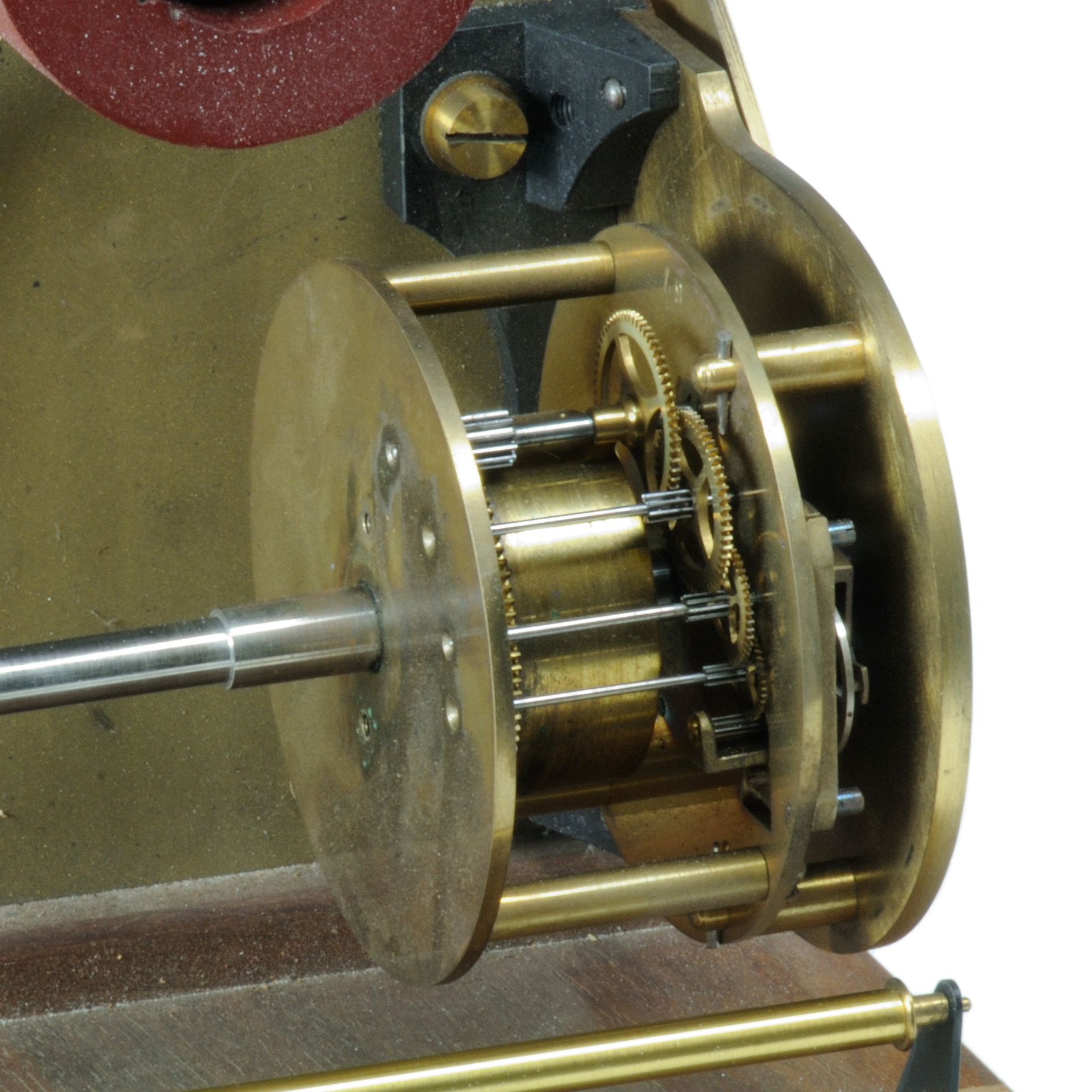 Das Messwerk ist in einem Holzgehäuse eingebaut, deren vorderer Teil inklusive Sichtglas abgenommen werden kann. Das Messwerk selbst besteht aus einem kräftigen Drehspulmeßwerk, das in einem großen, U-förmigen Magneten fixiert ist. Der Zeiger, aus Aluminium gefertigt, wird oben in die Messing-Hülse, die direkt am Messwerk sitzt, eingesteckt. Die kleine Messing-Hülse am Zeiger dient zur Ausrichtung des Nullpunkts. Die Farbe wird in einem kleinen Schreibkopf, der drehbar am unteren Ende des Zeigers befestigt ist, eingefüllt. Die Tinte wird über eine dünne Rille außen auf das Papier übertragen. Der Schreiber besitzt einen Uhrwerk-Antrieb, der die große Schreiber-Trommel dreht. Der Mechanismus wird über den Hebel rechts aufgezogen. |